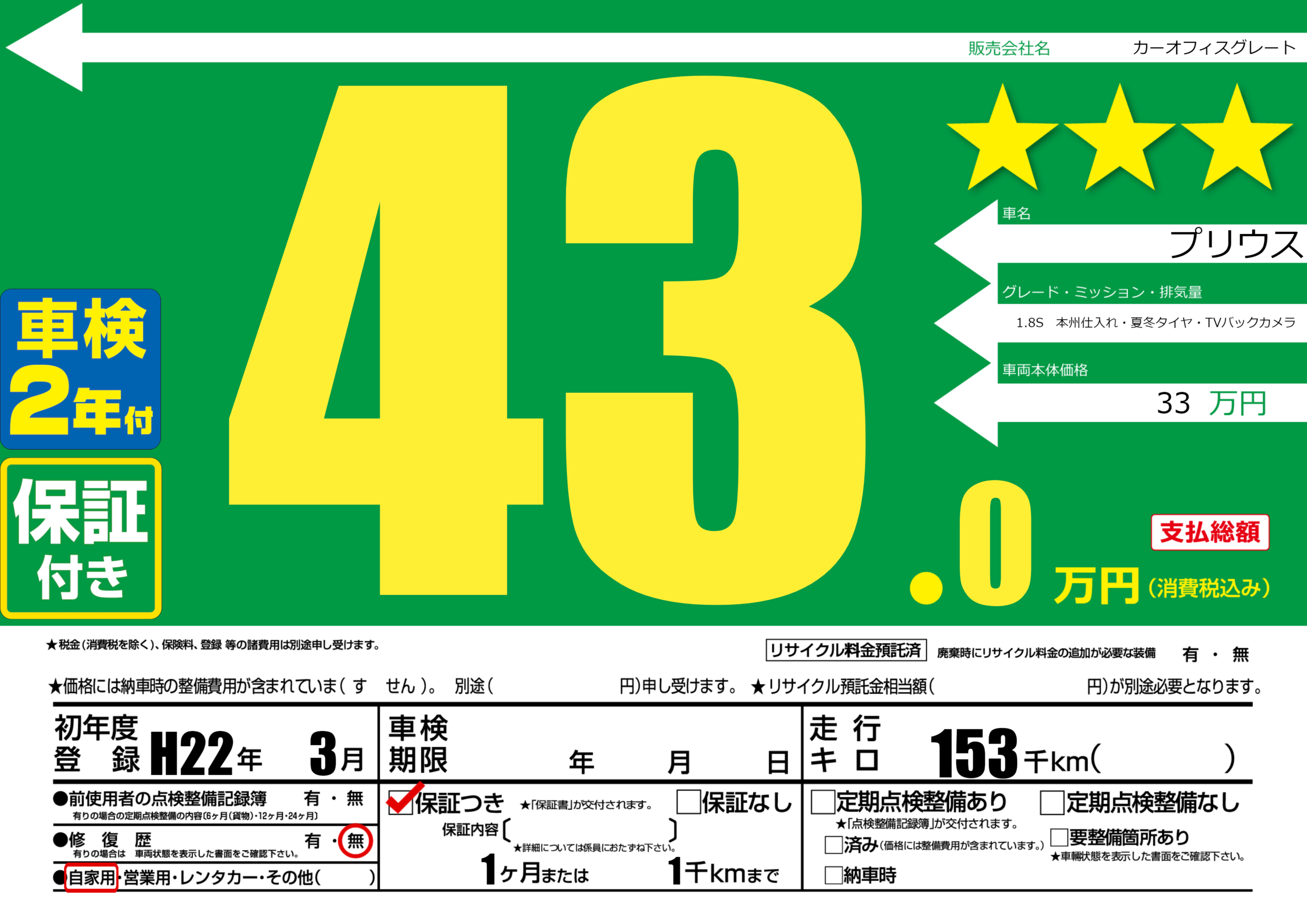 | 車名 | プリウス | グレード ミッション 排気量 |