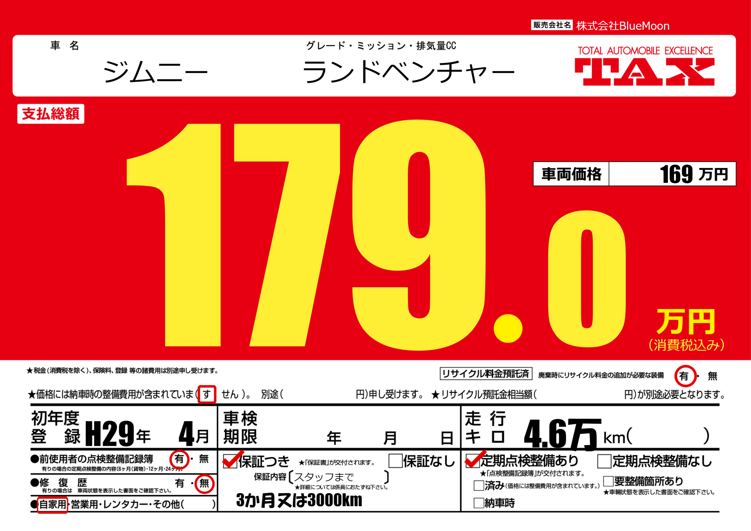 保証付き 保証内容(スタッフまで) ---ヶ月または()千kmまで |