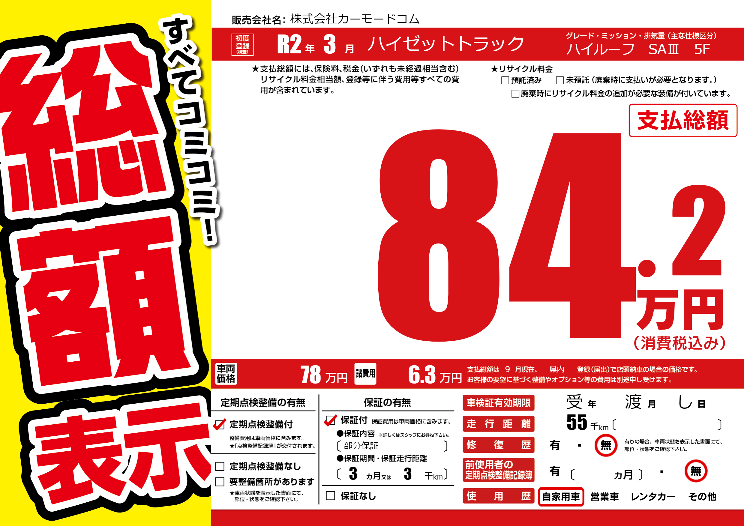 | 車名 | ハイゼットトラック | グレード ミッション 排気量 |