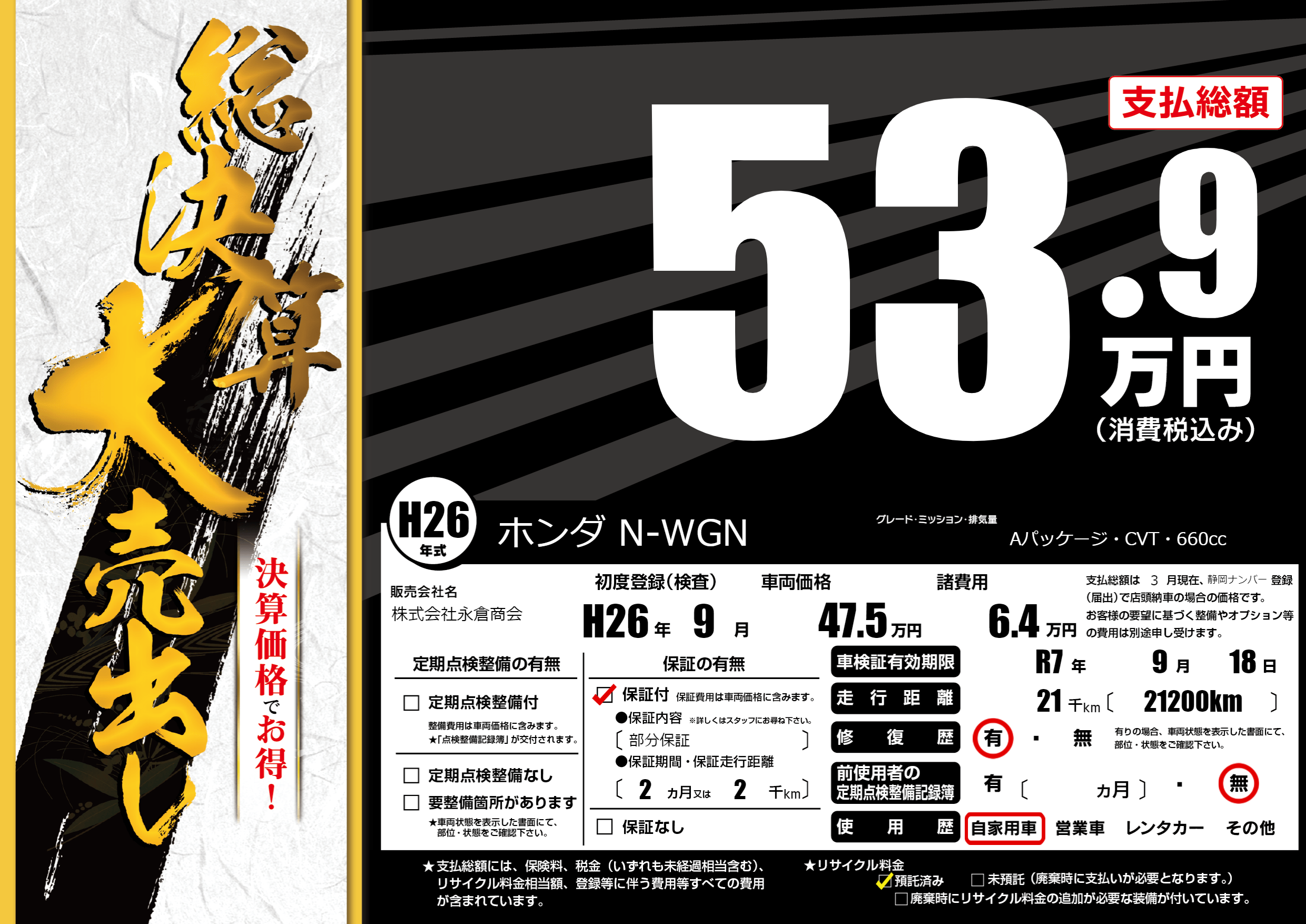 | 車名 | ホンダ N-WGN | グレード ミッション 排気量 |