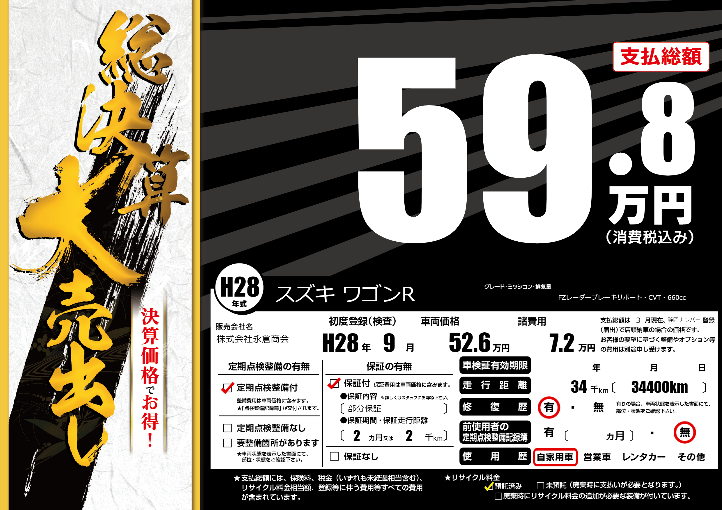 | 走行キロ | 3.4万km | 初年度登録 | H28年9月 |