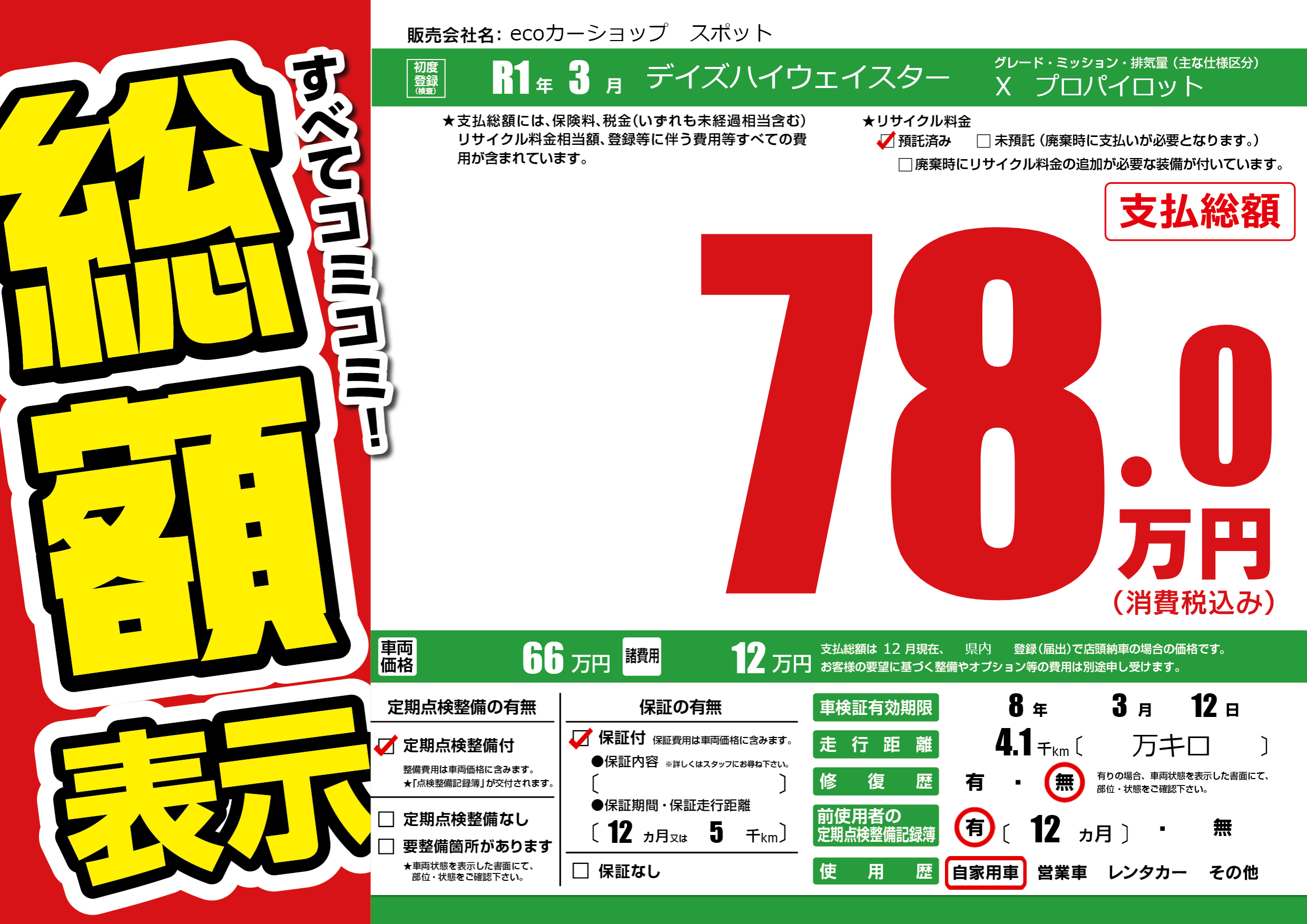 | 走行キロ | 0.4万km | 初年度登録 | R1年3月 |