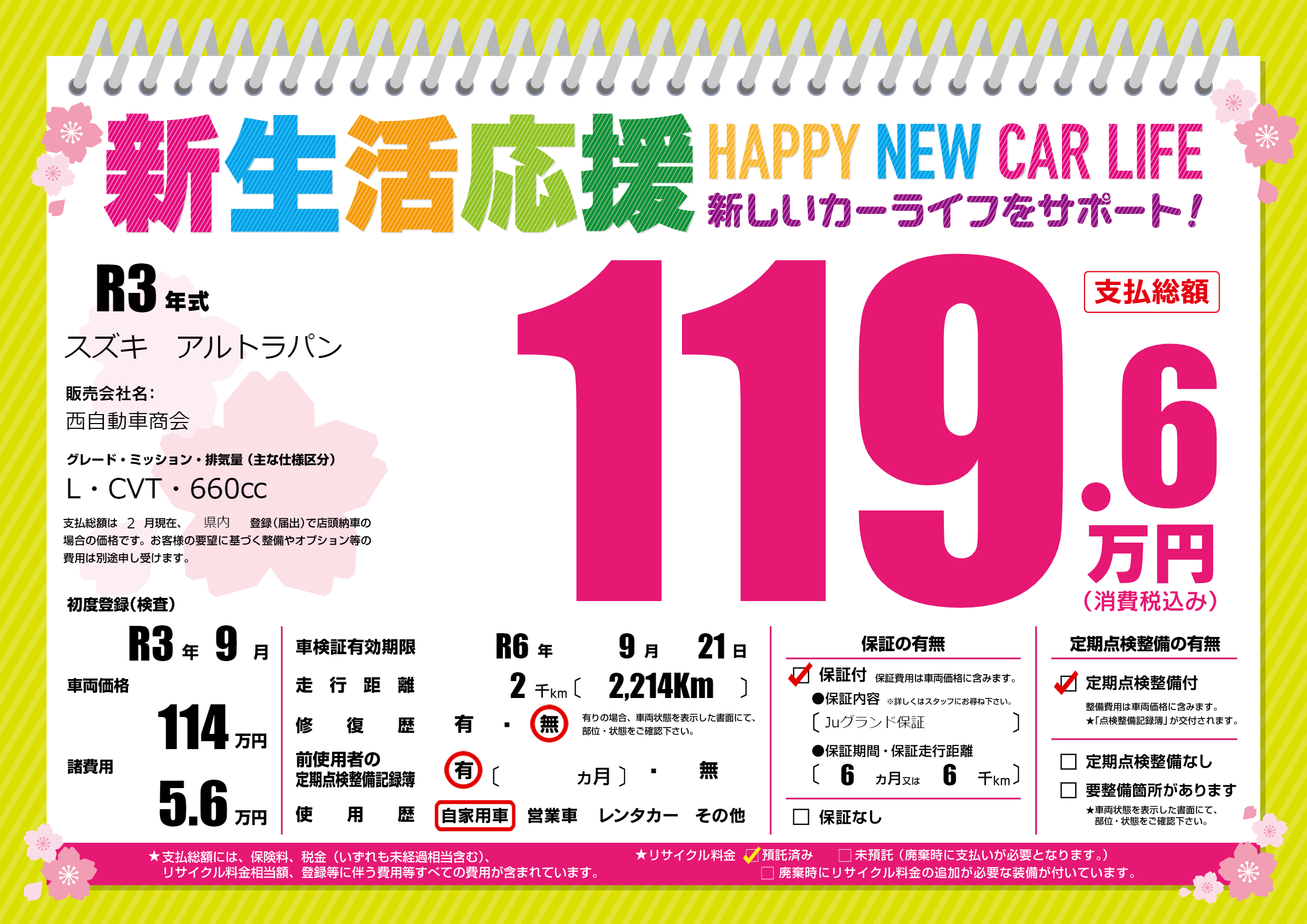 | 走行キロ | 0.2万km | 初年度登録 | R3年9月 |