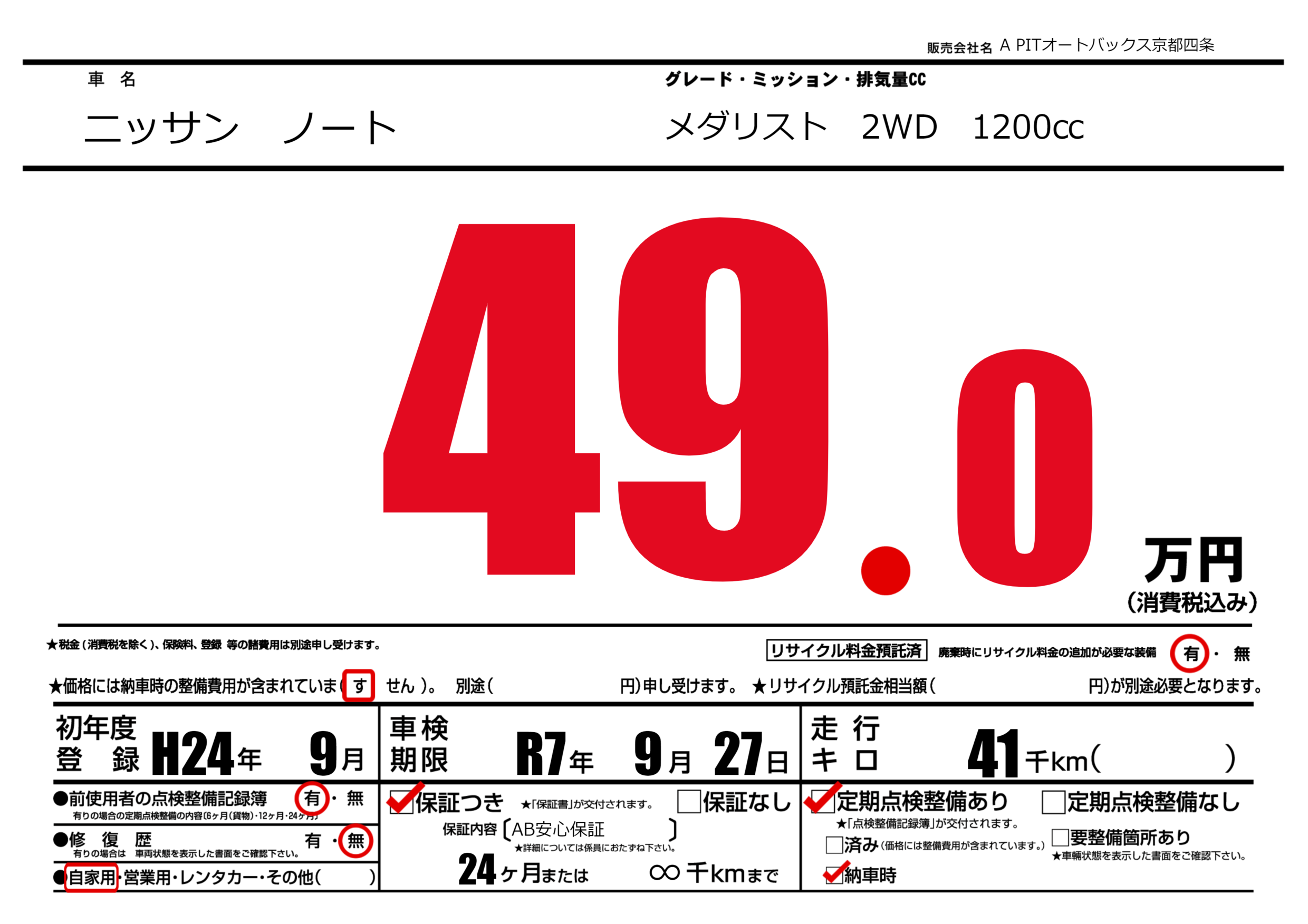 | 車名 | ニッサン ノート | グレード ミッション 排気量 |