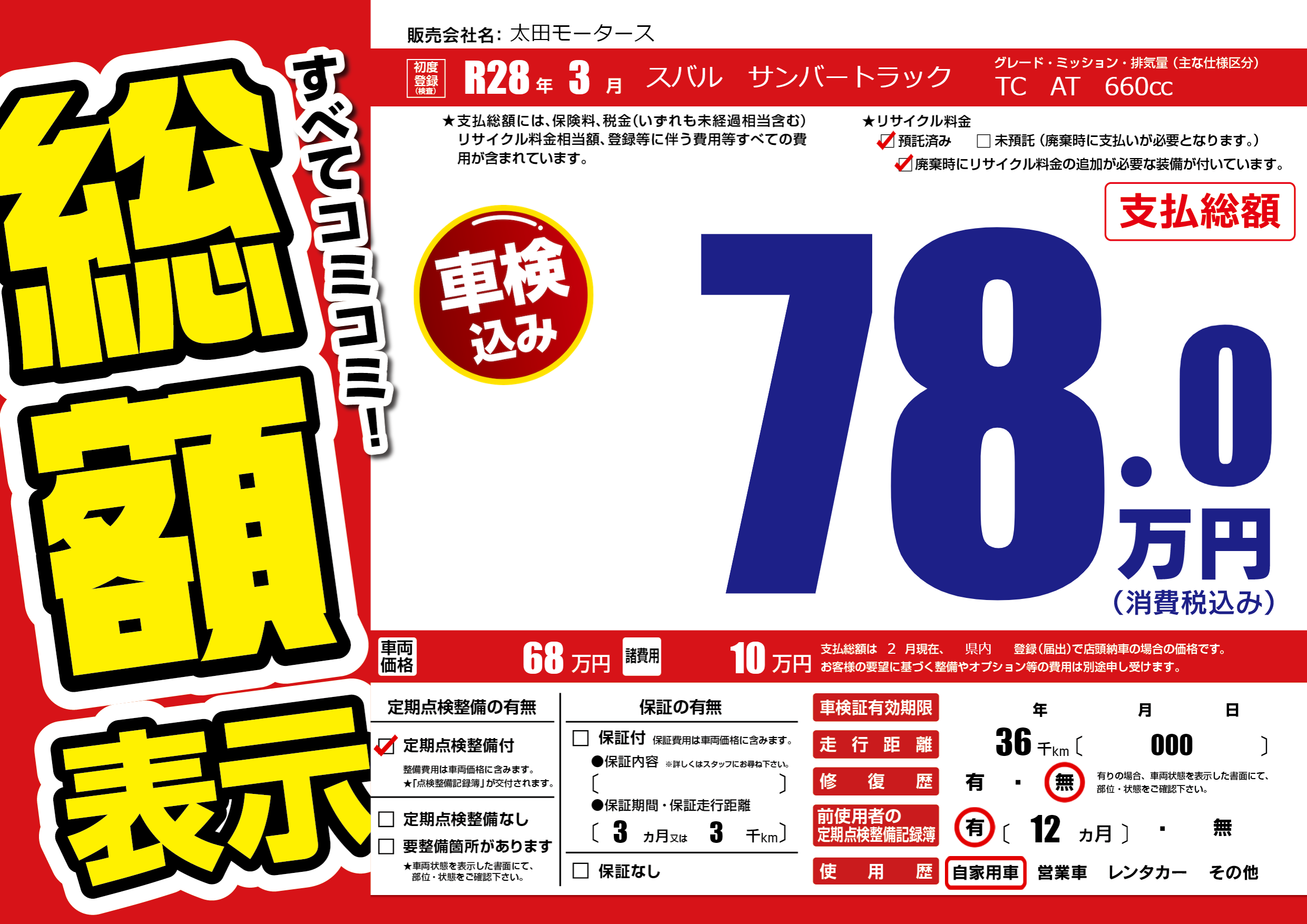 | 車名 | スバル サンバートラック | グレード ミッション 排気量 |
