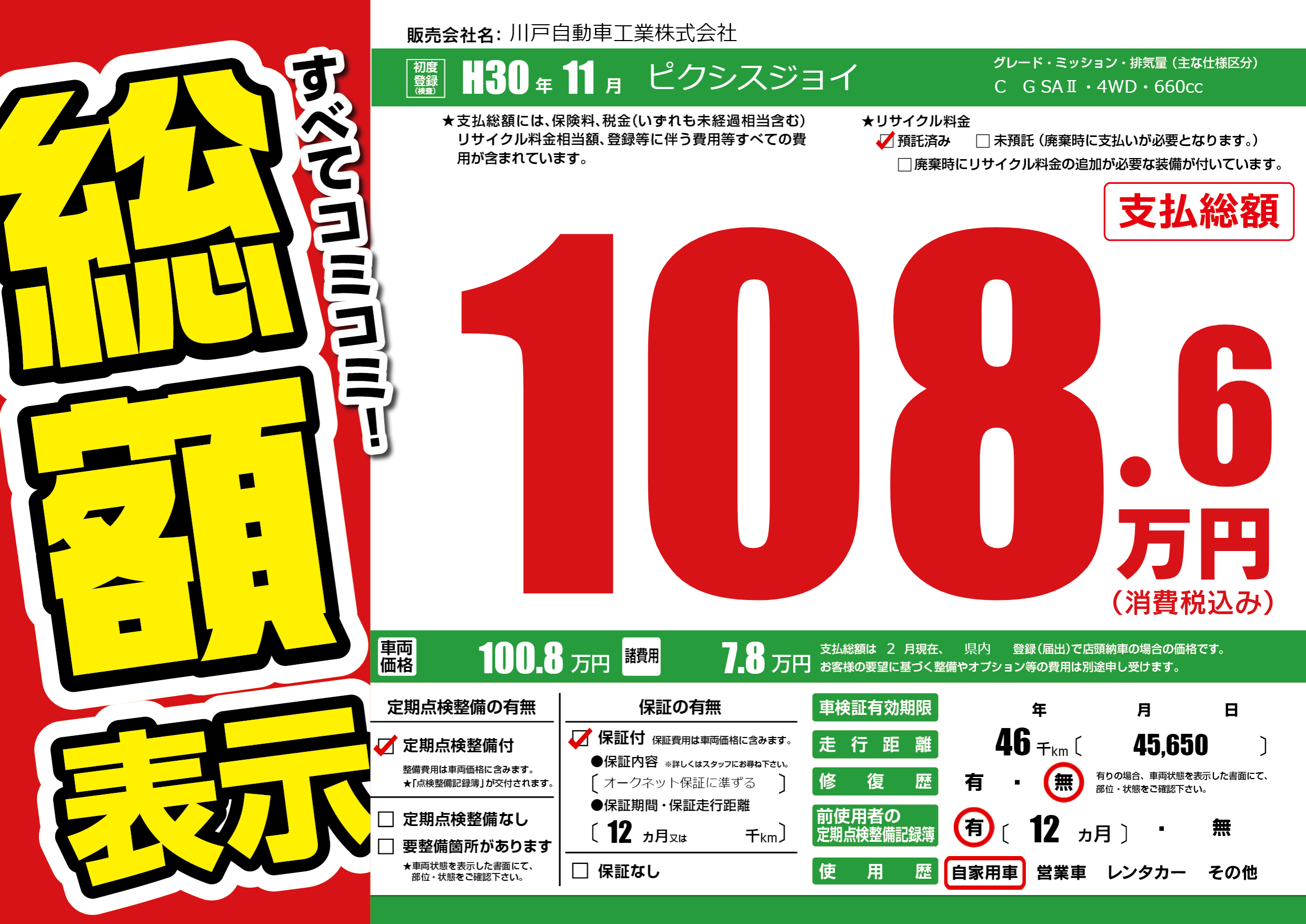 | 走行キロ | 4.6万km | 初年度登録 | H30年11月 |