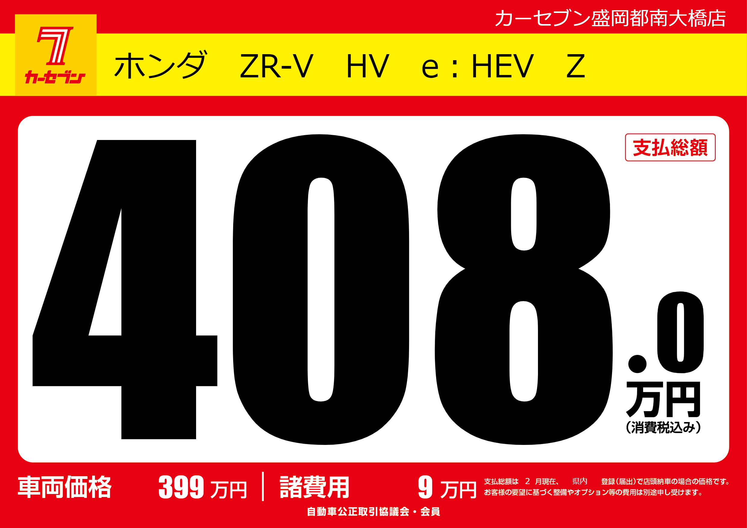 | 車名 | ホンダ ZR-V HV e:HEV Z | グレード ミッション 排気量 |