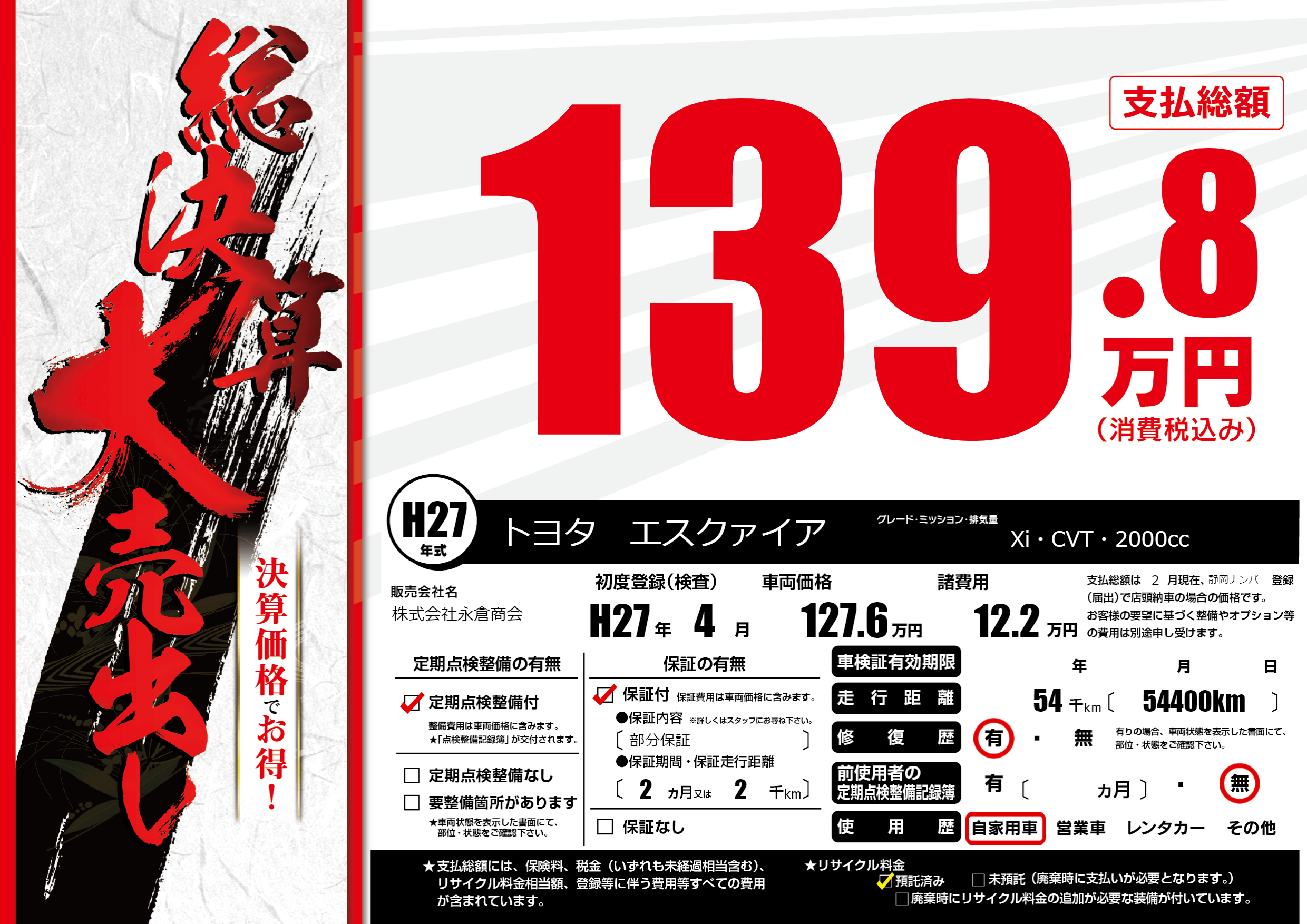 | 走行キロ | 5.4万km | 初年度登録 | H27年4月 |