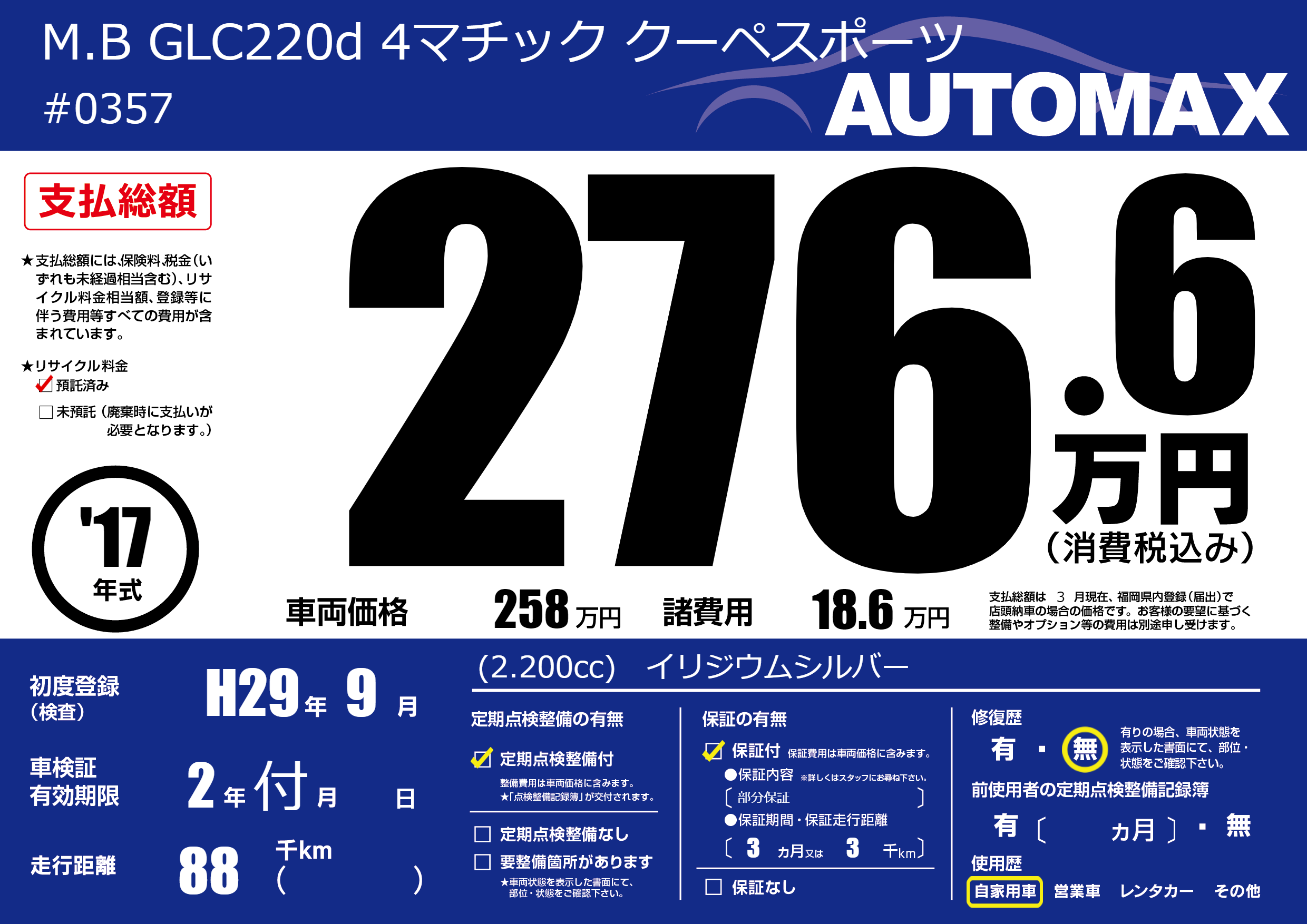 | 車名 | M.B GLC220d 4マチック クーペスポーツ | グレード ミッション 排気量 |