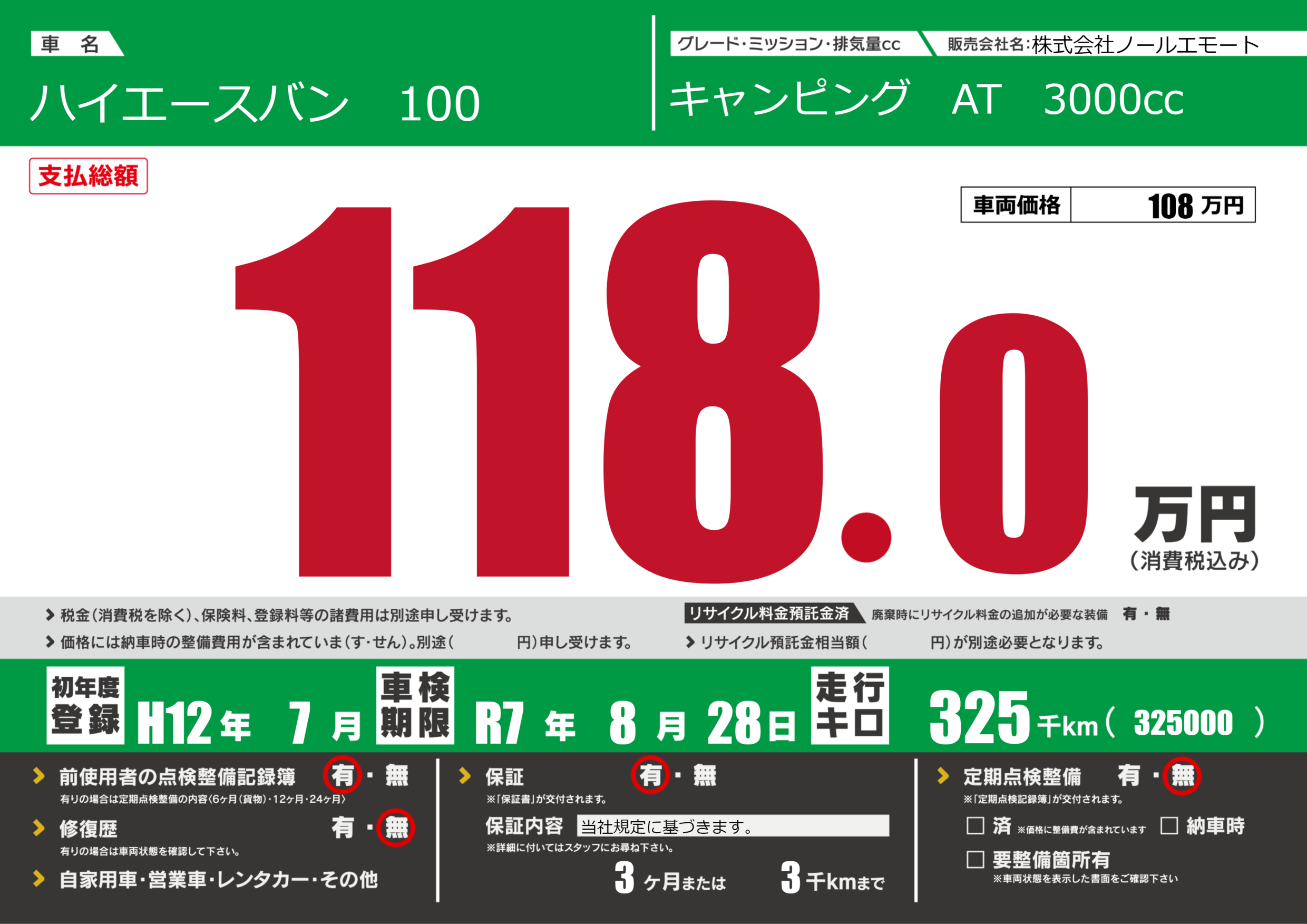 保証付き 保証内容(当社規定に基づきます。) 3ヶ月または(3)千kmまで |