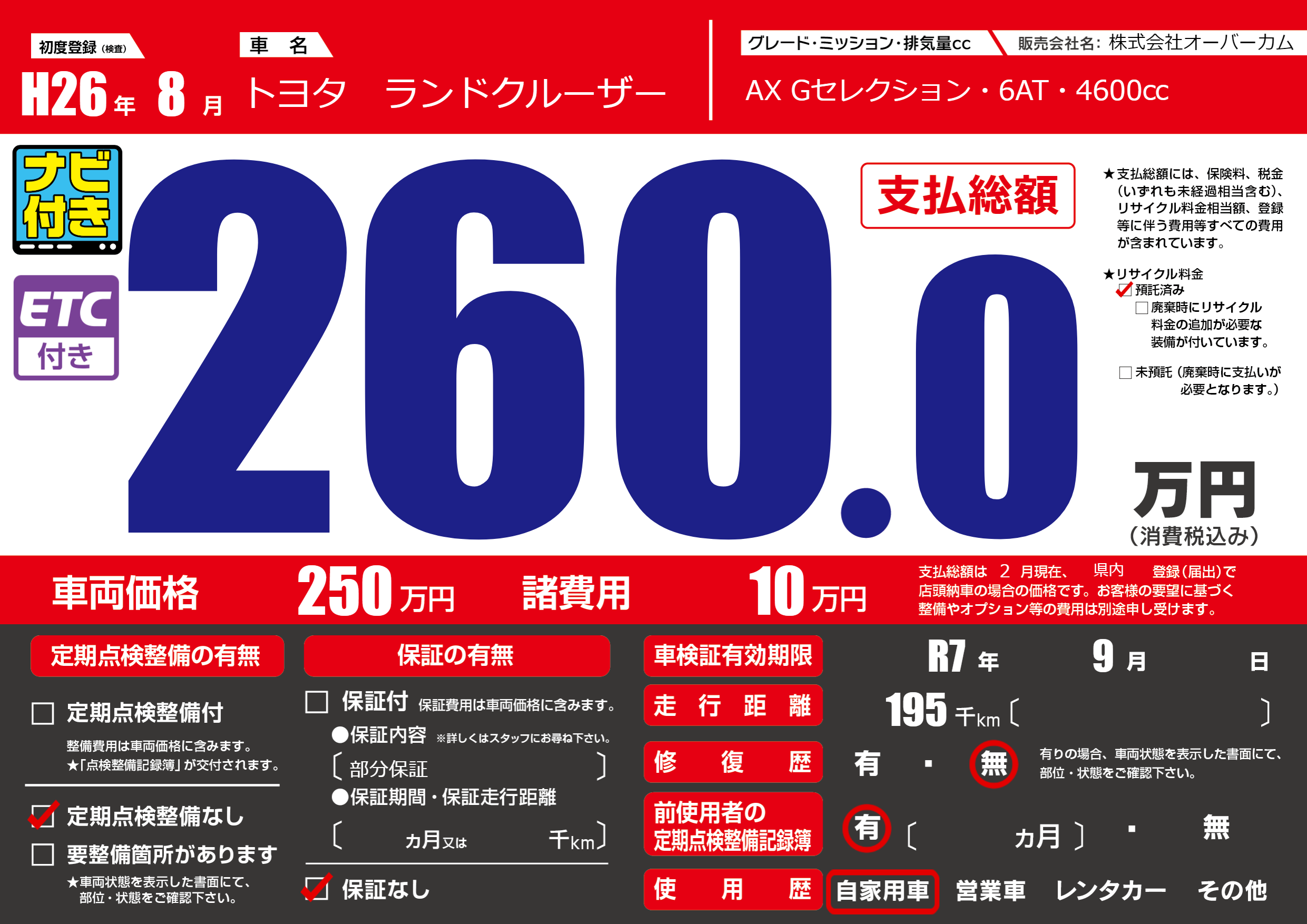 | 車検制限 | R7年 9月 - 日 | ||