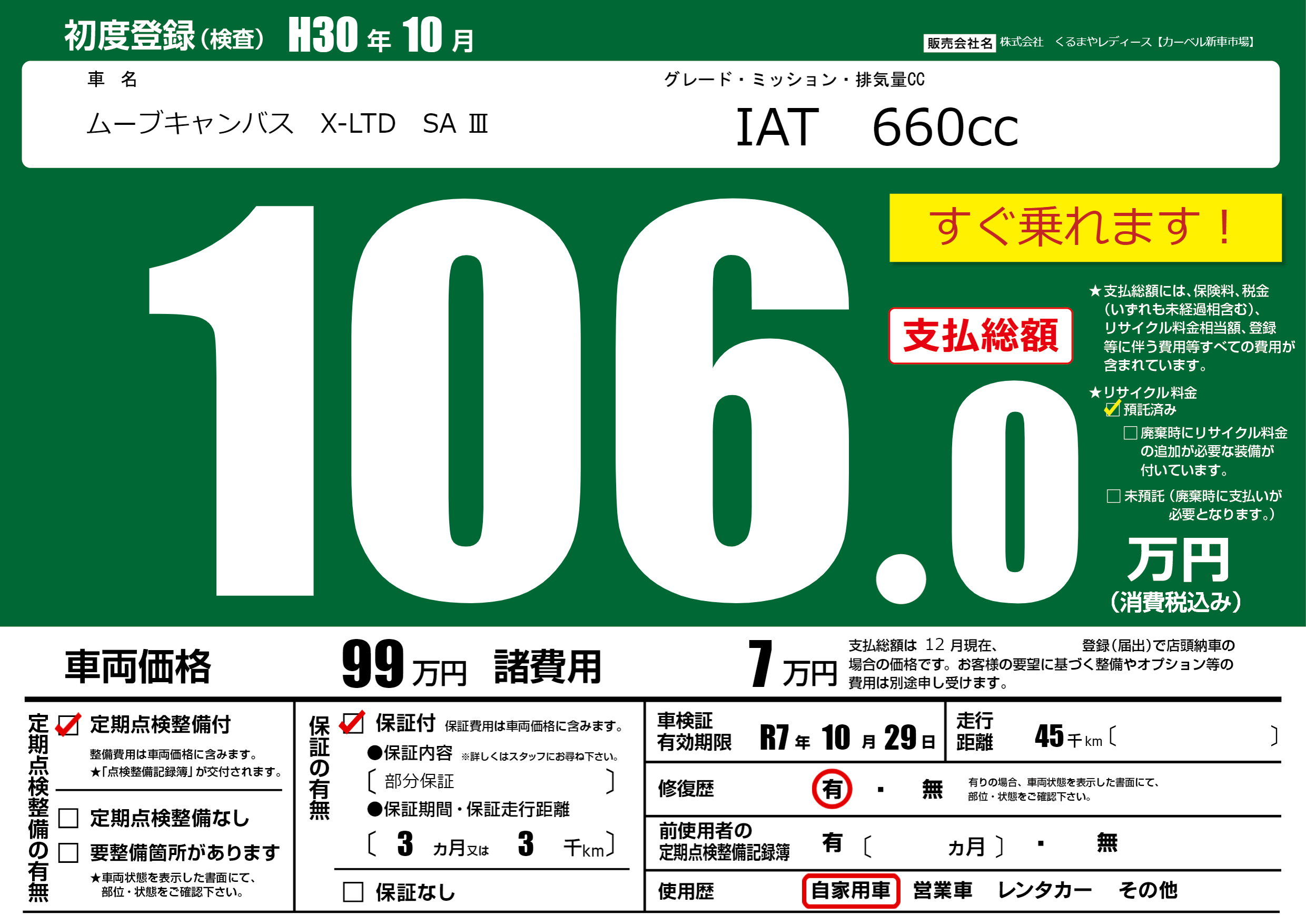 | 走行キロ | 4.5万km | 初年度登録 | H30年10月 |