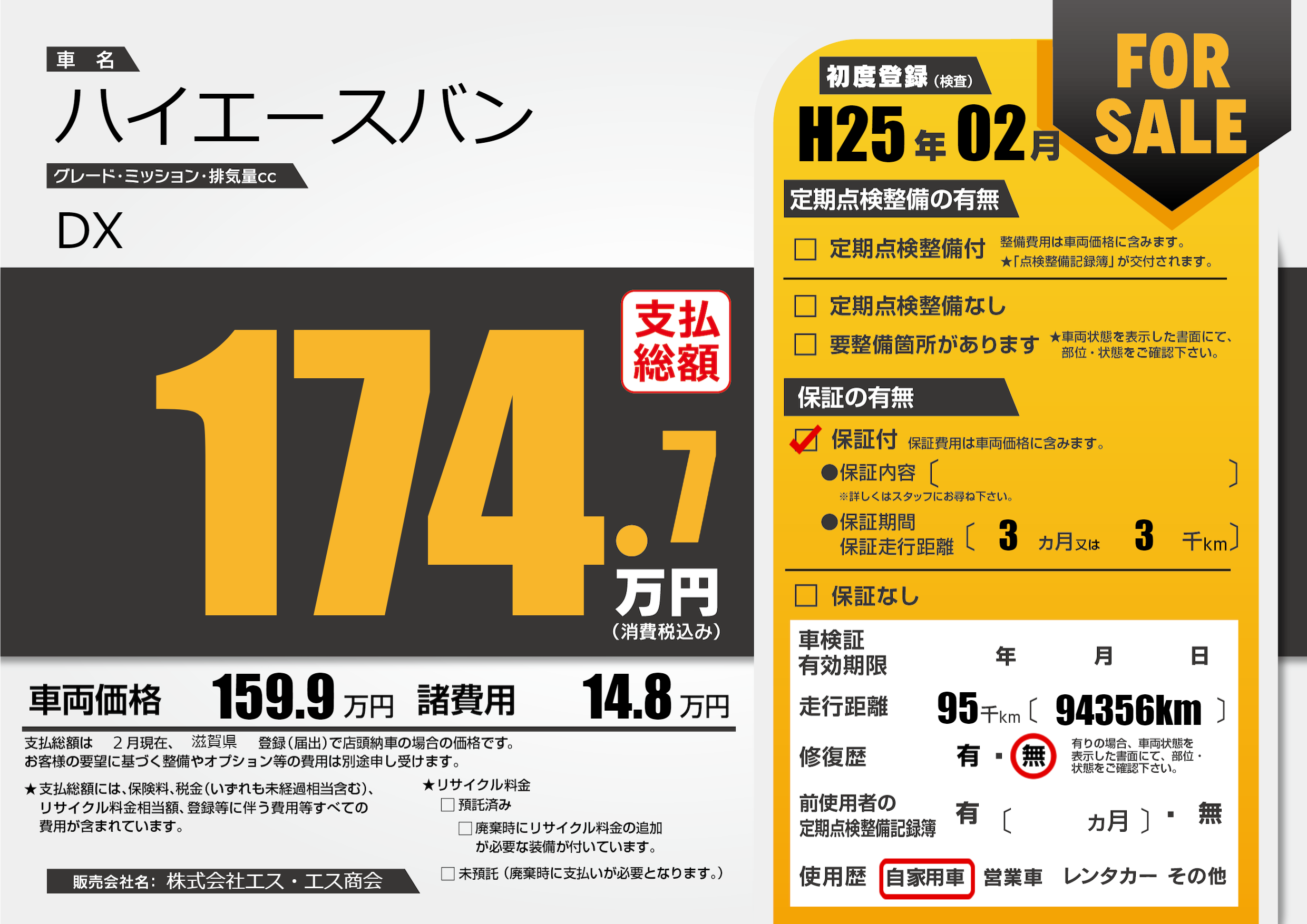 | 車名 | ハイエースバン | グレード ミッション 排気量 |
