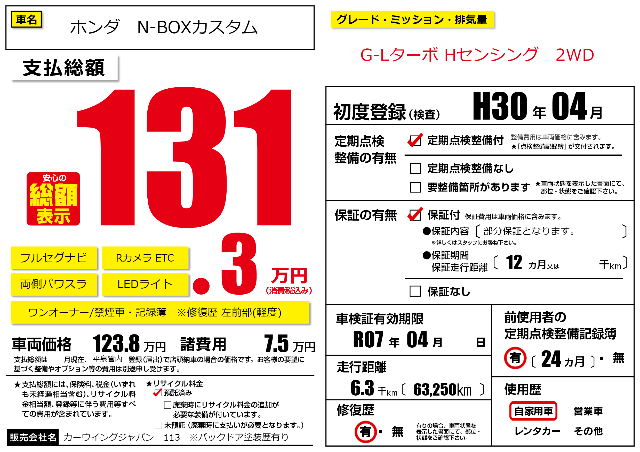 | 車検制限 | R07年 04月 - 日 | ||