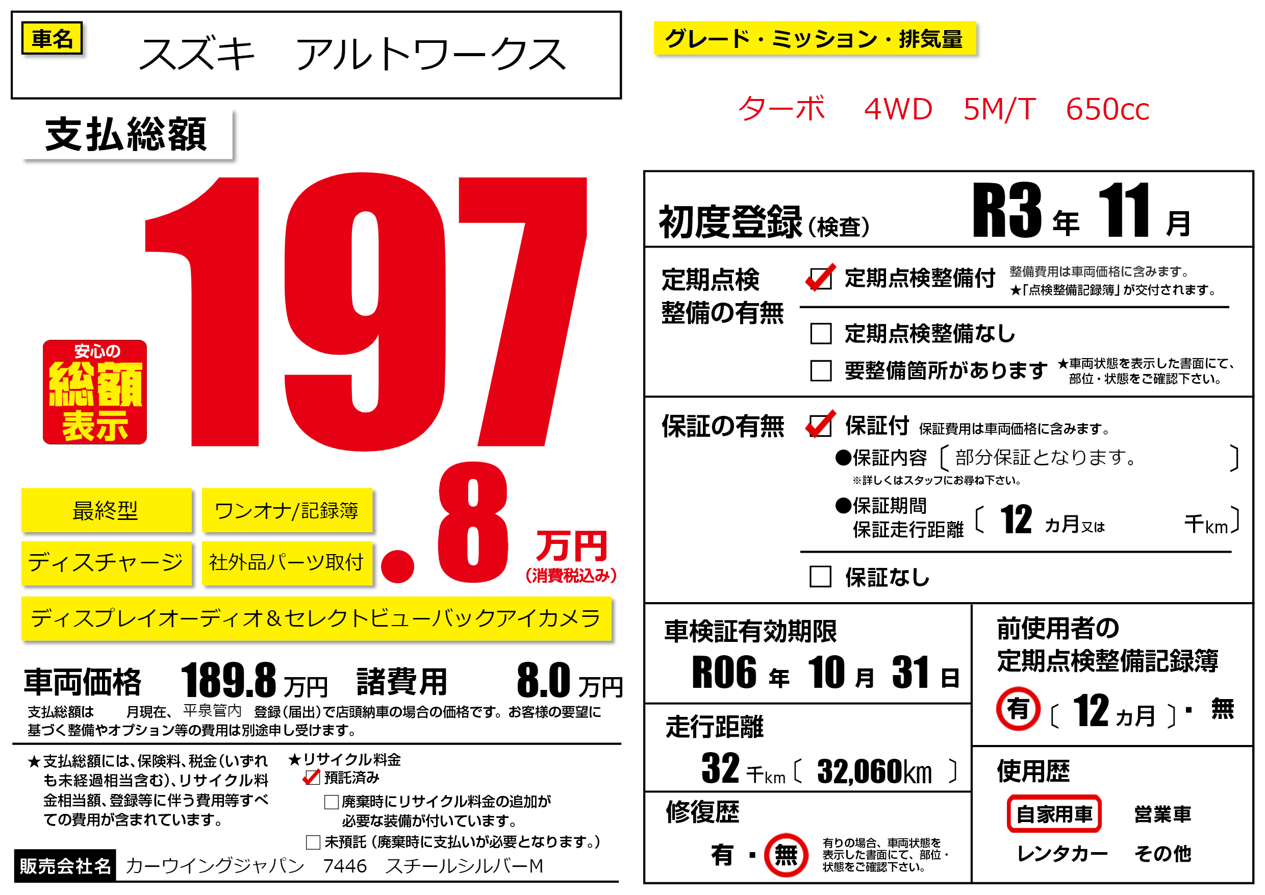 | 車名 | スズキ アルトワークス | グレード ミッション 排気量 |