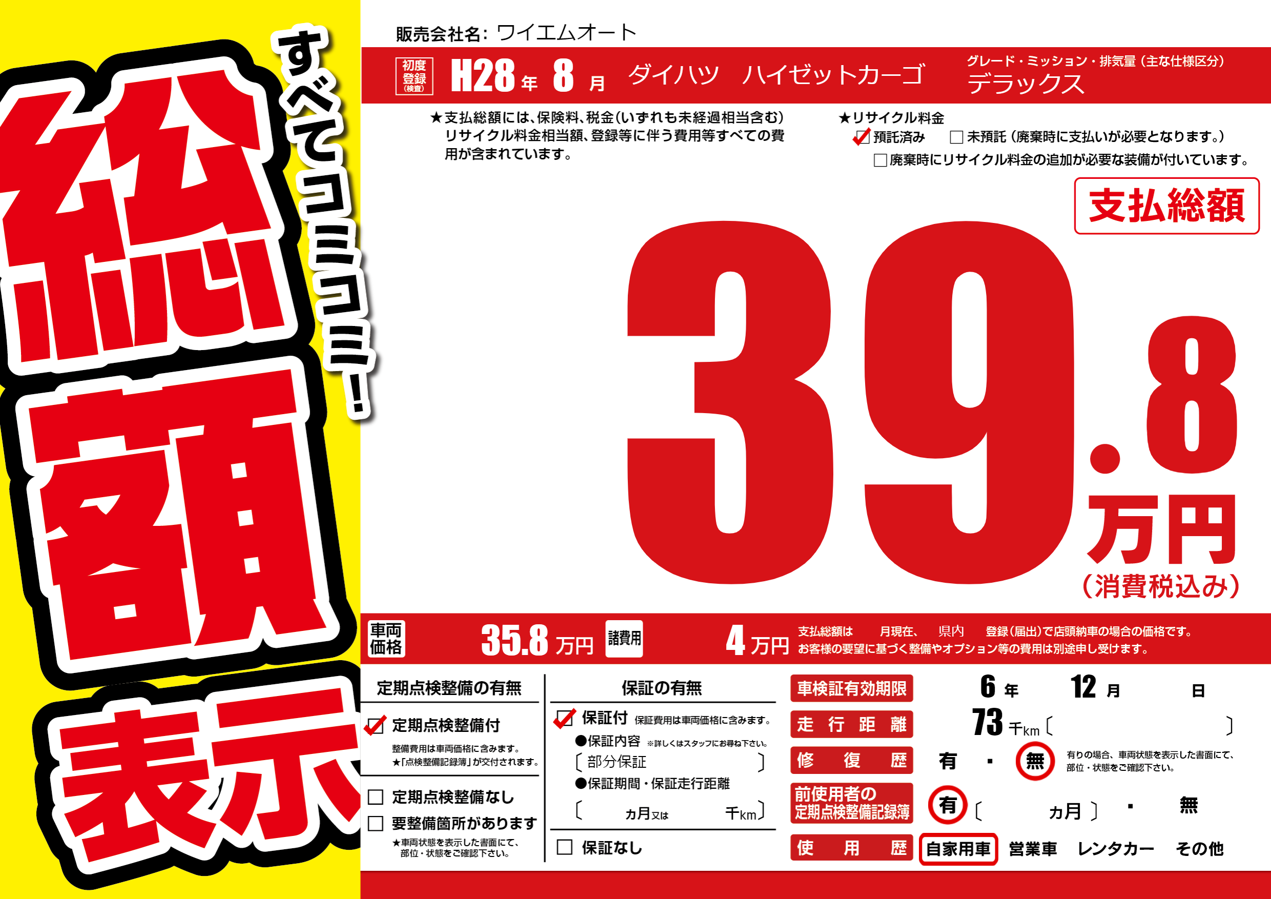 保証付き 保証内容(部分保証) ---ヶ月または()千kmまで |