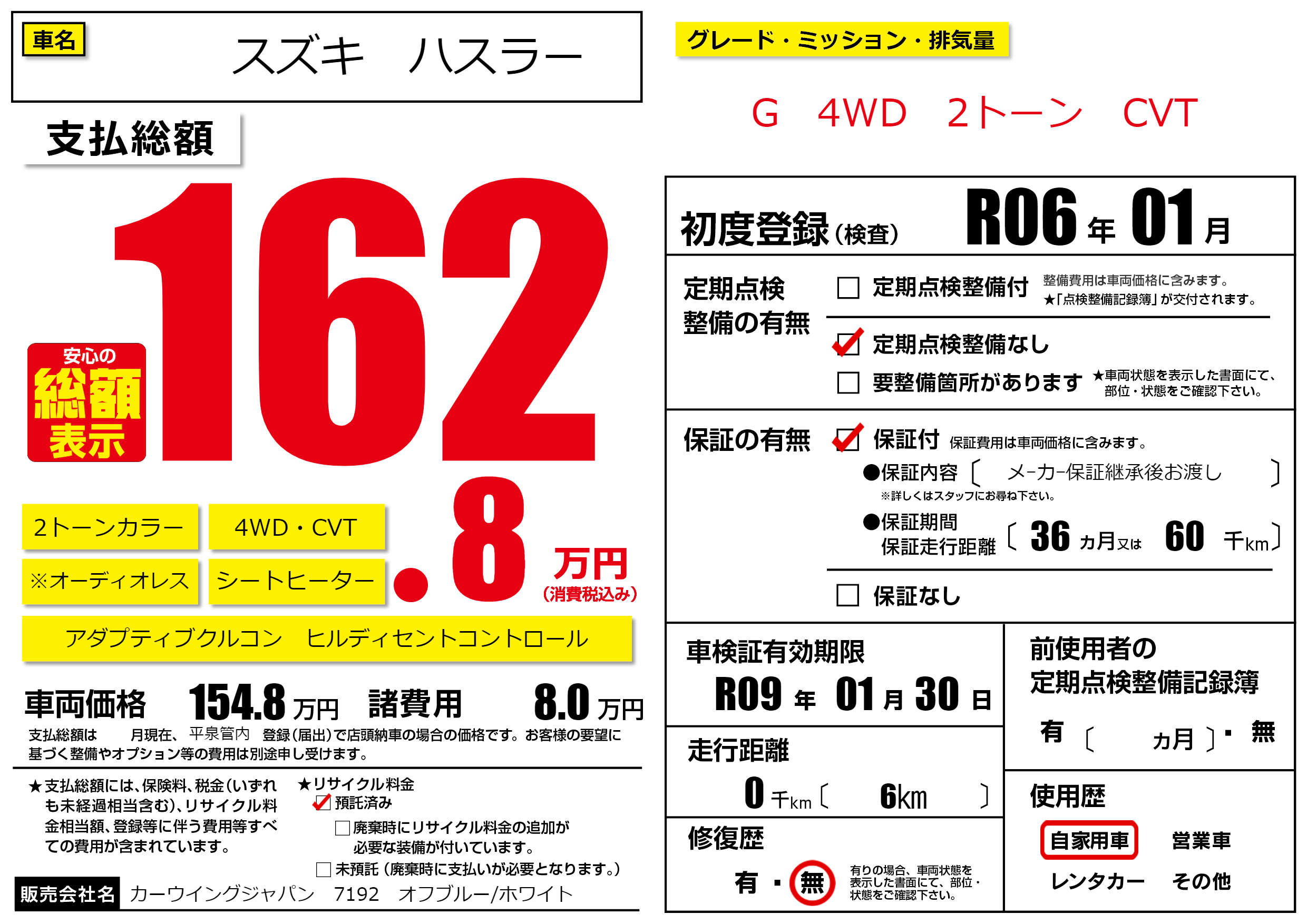 | 車名 | スズキ ハスラー | グレード ミッション 排気量 |