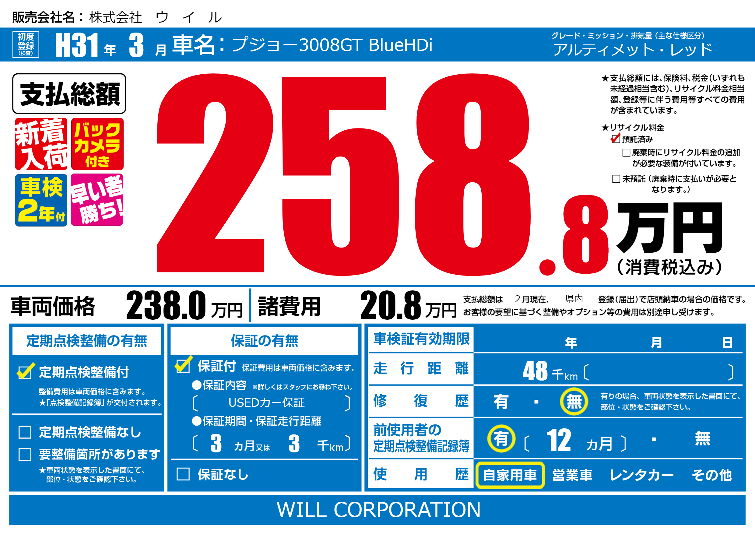 | 車名 | プジョー3008GT BlueHDi | グレード ミッション 排気量 |