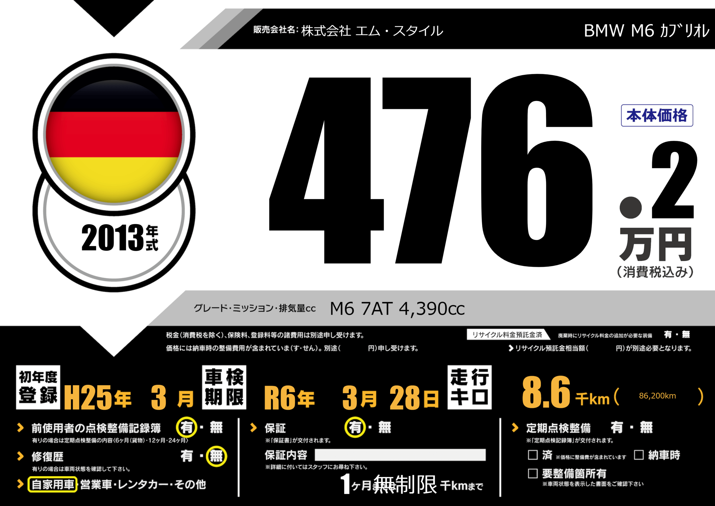 | 車名 | BMW M6 カブリオレ | グレード ミッション 排気量 |