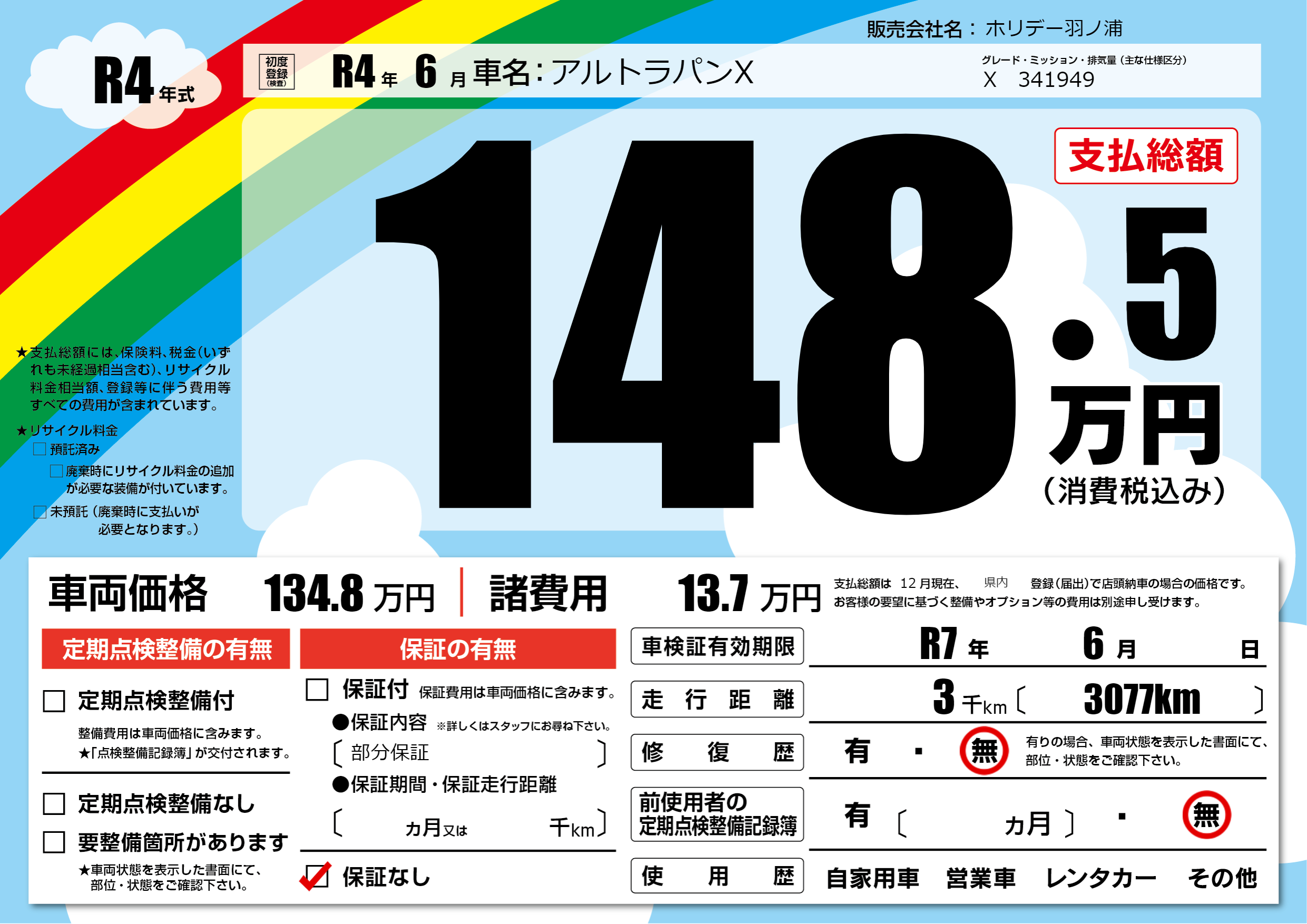 | 走行キロ | 0.3万km | 初年度登録 | R4年6月 |