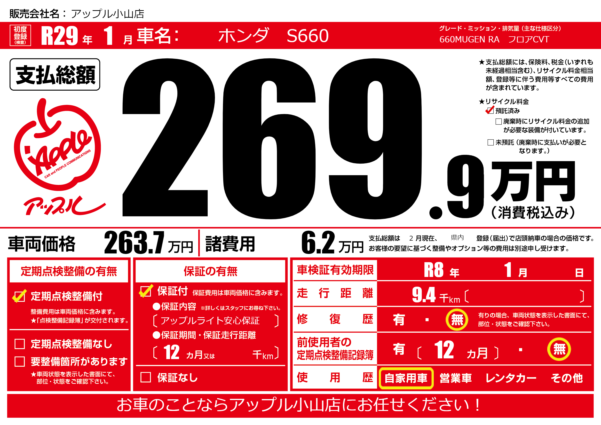 | 車名 | ホンダ S660 | グレード ミッション 排気量 |