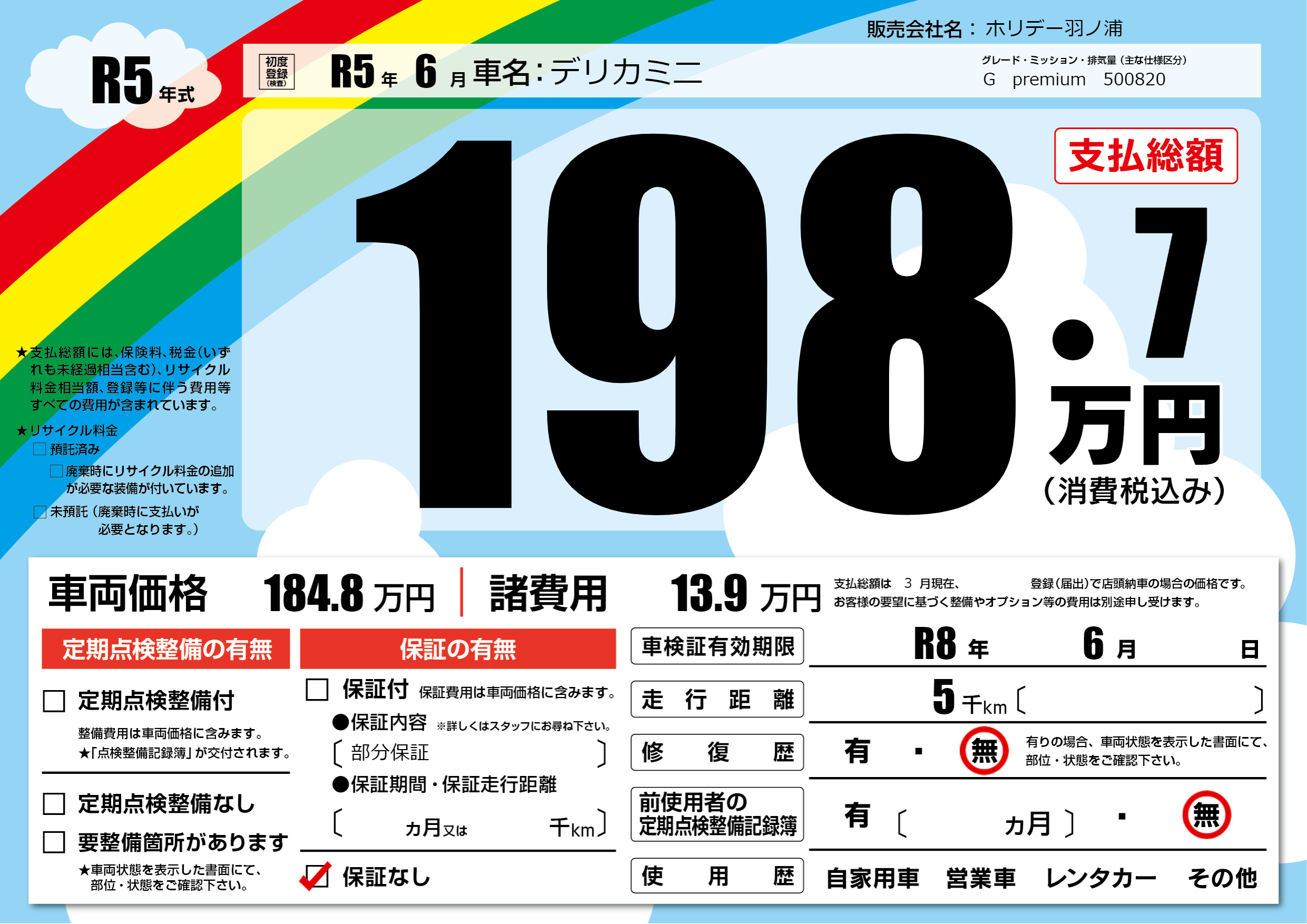 | 走行キロ | 0.5万km | 初年度登録 | R5年6月 |