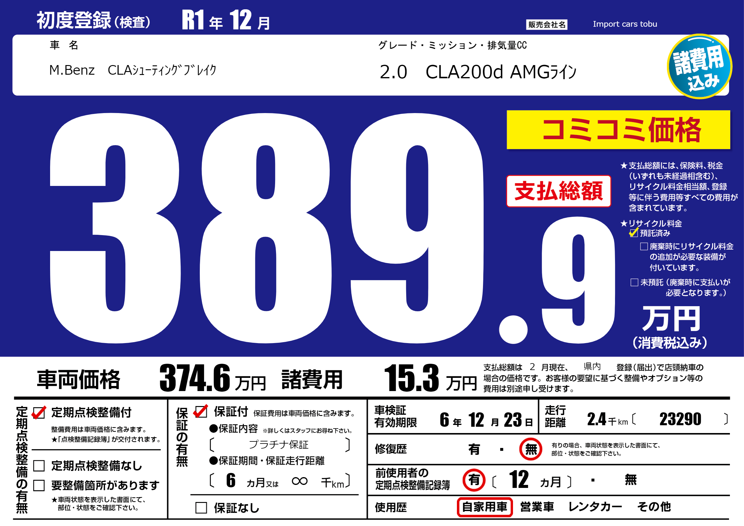 | 車名 | M.Benz CLAシューティングブレイク | グレード ミッション 排気量 |
