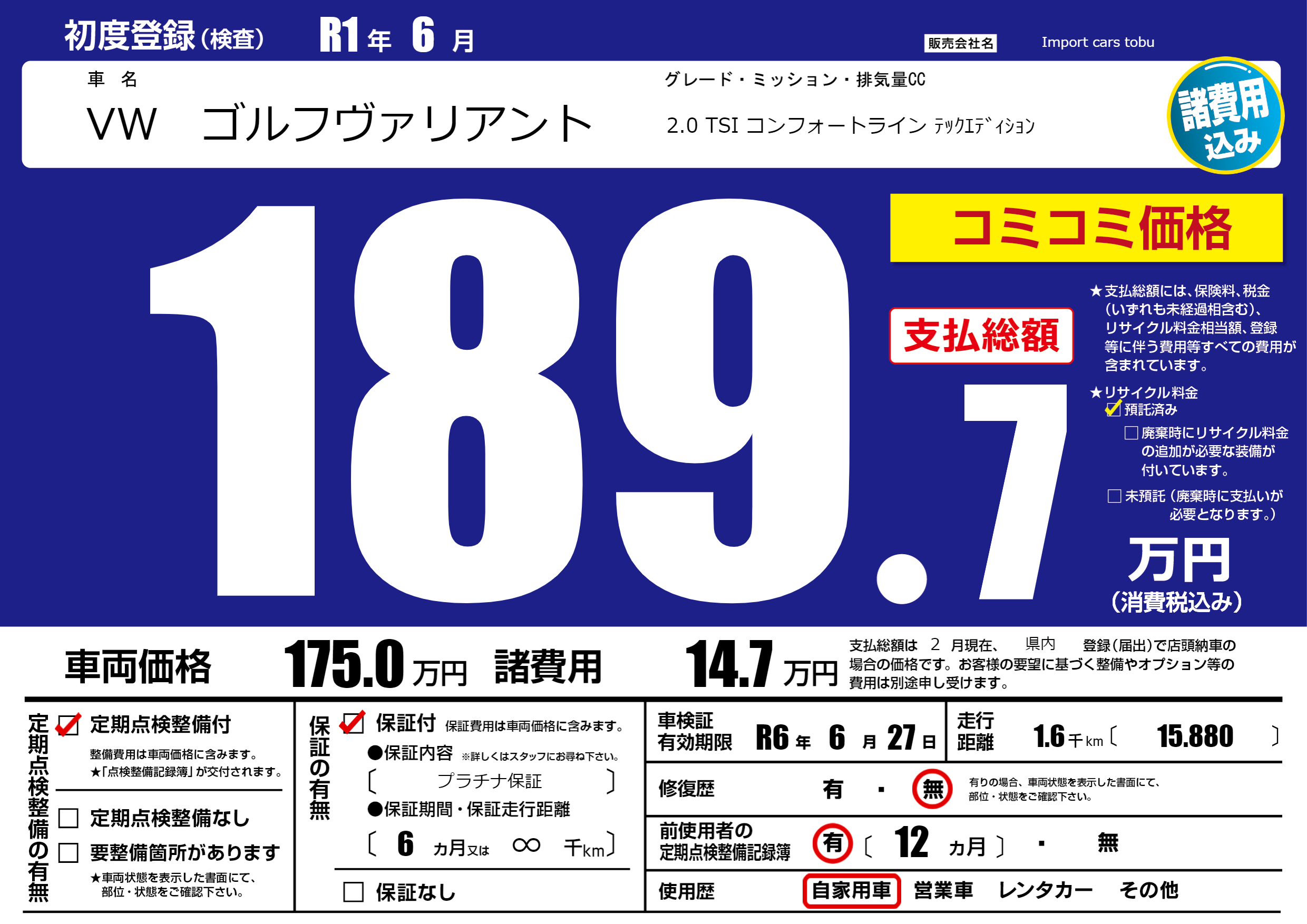 | 車名 | VW ゴルフヴァリアント | グレード ミッション 排気量 |