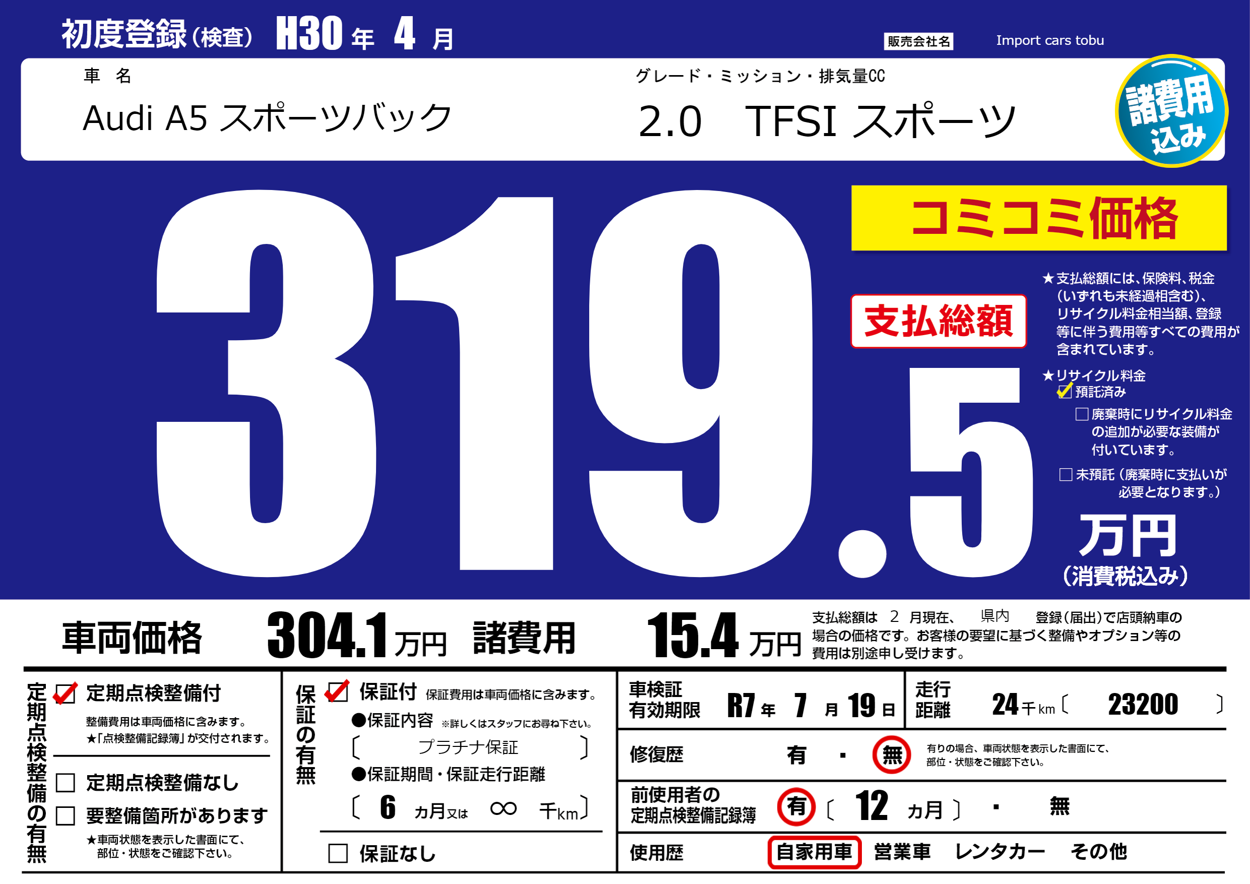 | 車名 | Audi A5 スポーツバック | グレード ミッション 排気量 |