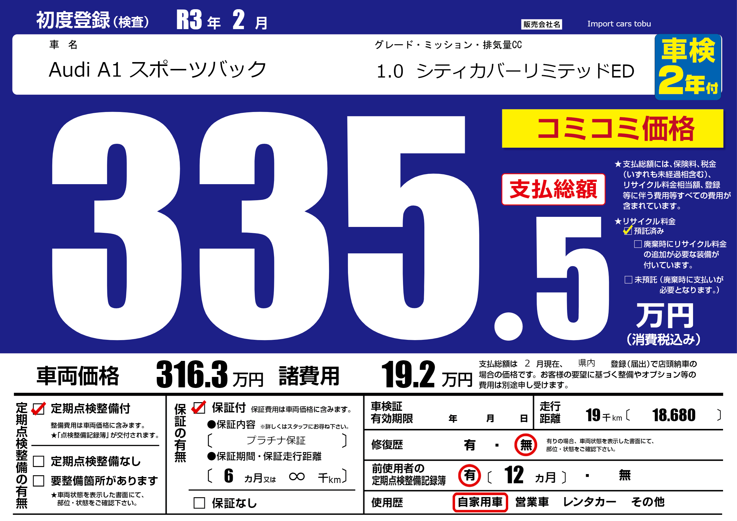 | 車名 | Audi A1 スポーツバック | グレード ミッション 排気量 |