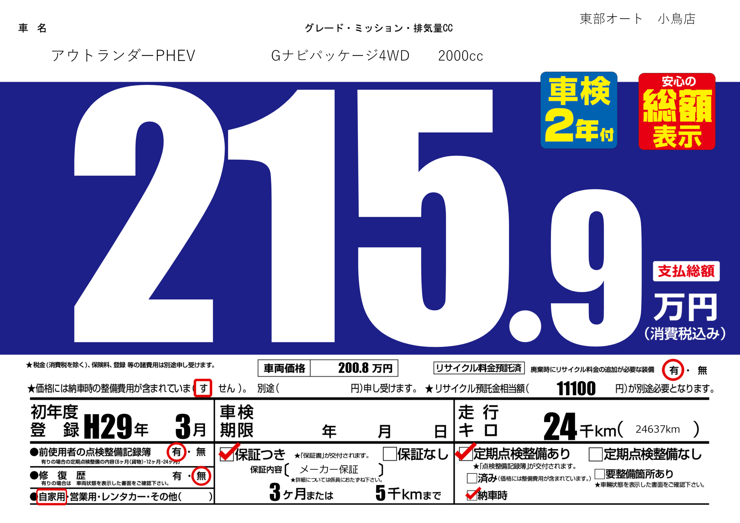 保証付き 保証内容( メーカー保証) 3ヶ月または(5)千kmまで |