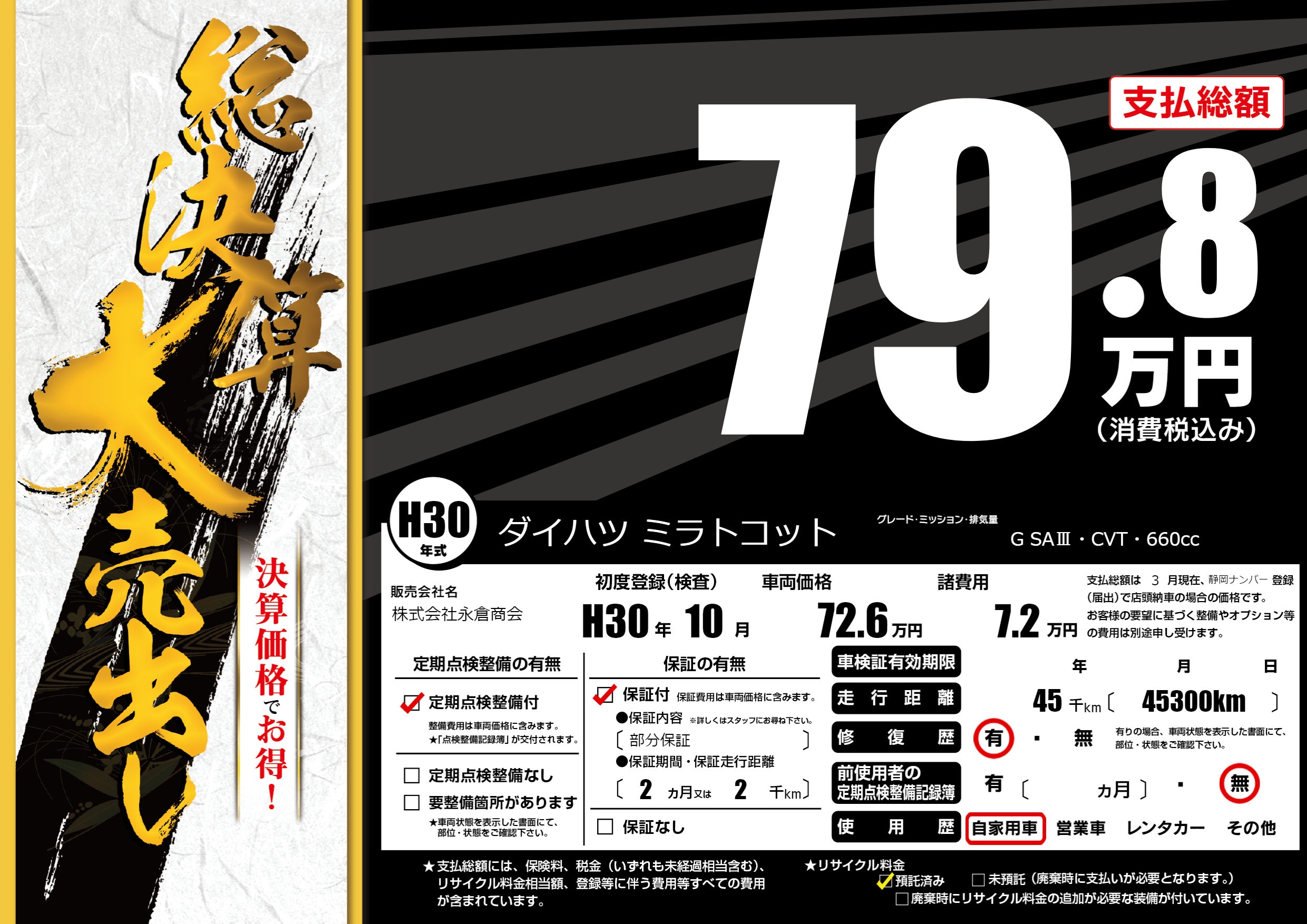 | 走行キロ | 4.5万km | 初年度登録 | H30年10月 |