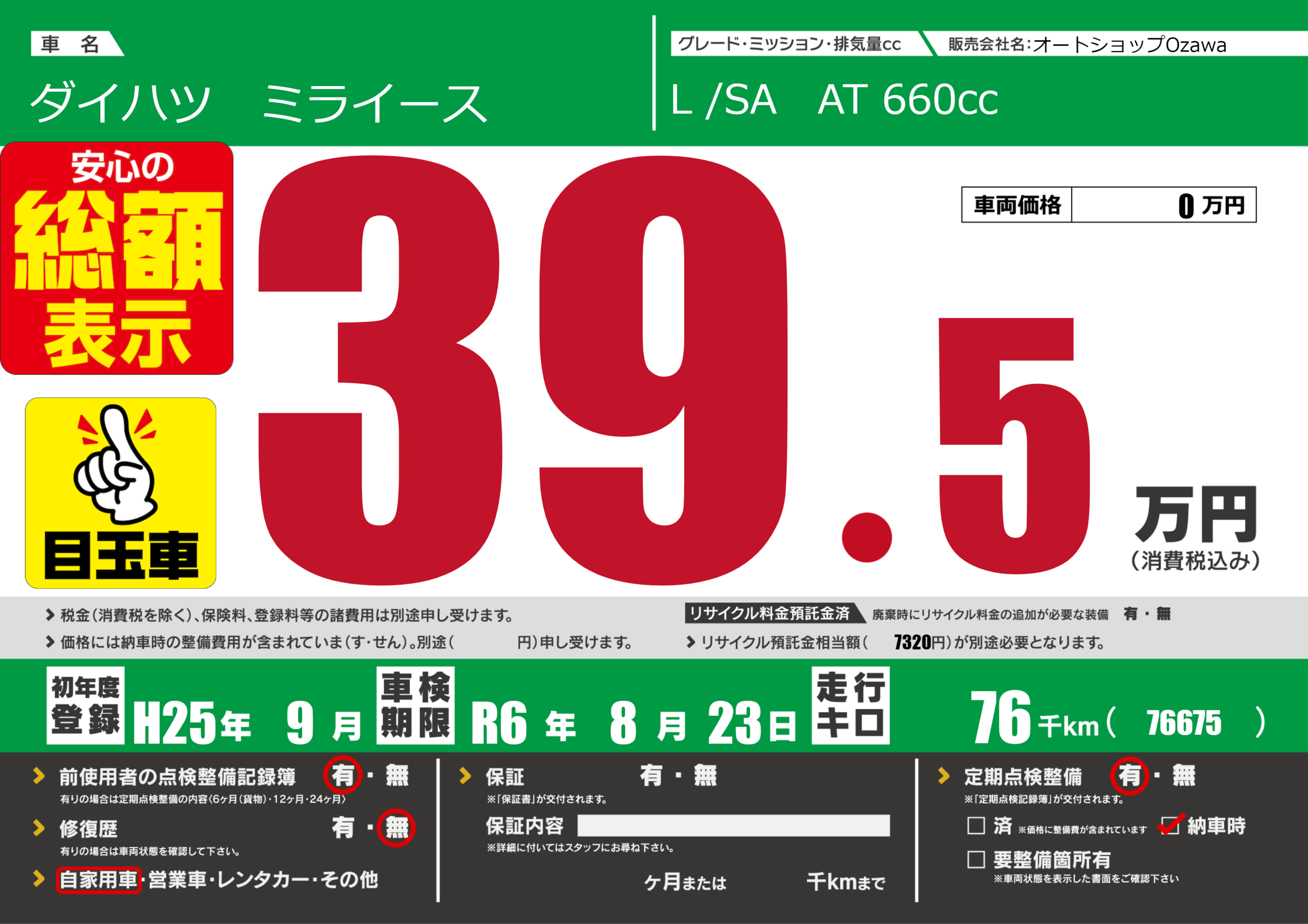 | 定期点検整備 | 定期点検整備あり 納車時あり | ||