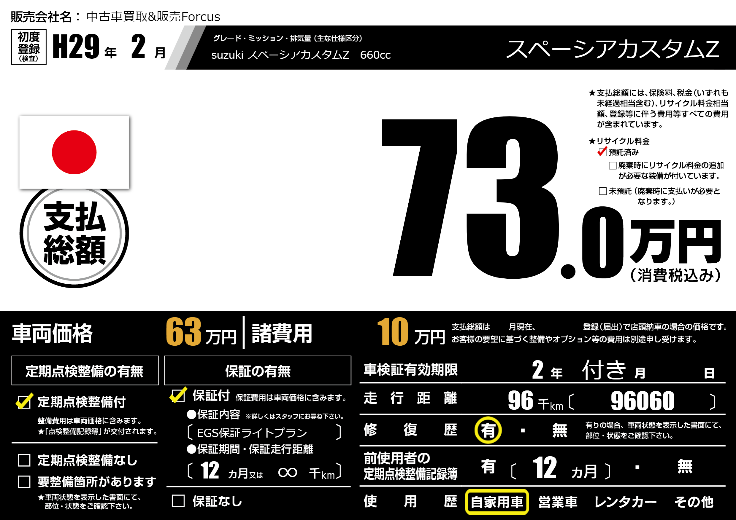 | 走行キロ | 9.6万km | 初年度登録 | H29年2月 |