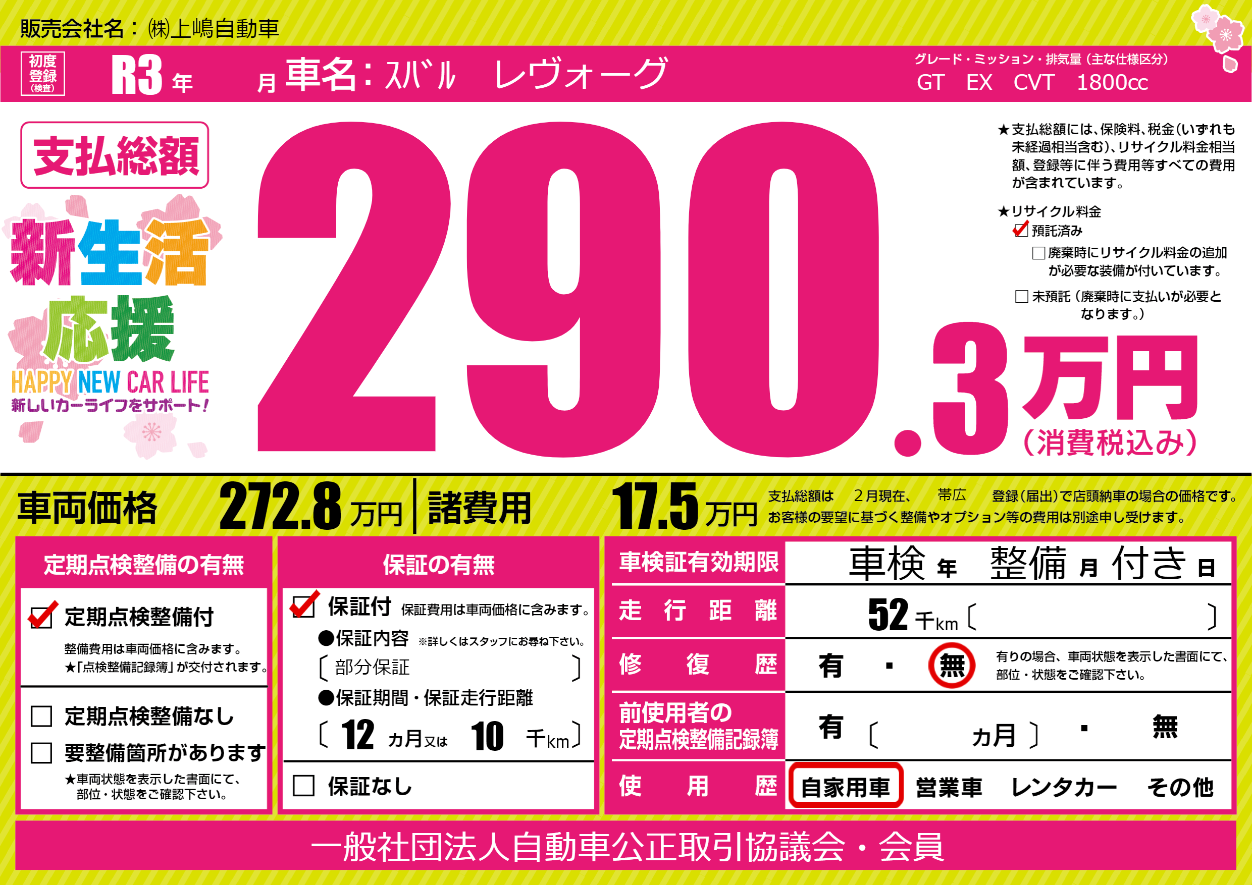 | 車名 | スバル レヴォーグ | グレード ミッション 排気量 |