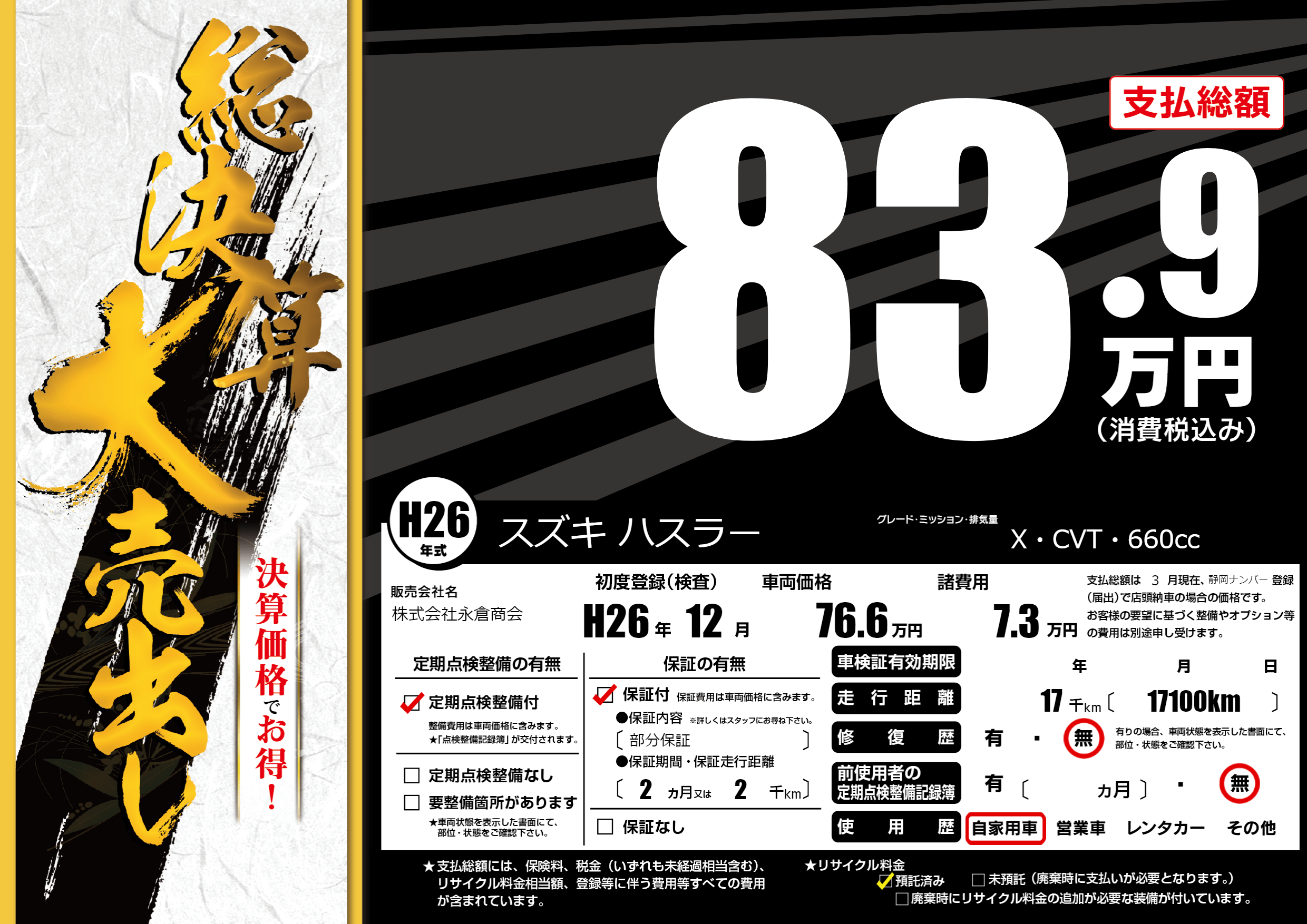 | 車名 | スズキ ハスラー | グレード ミッション 排気量 |