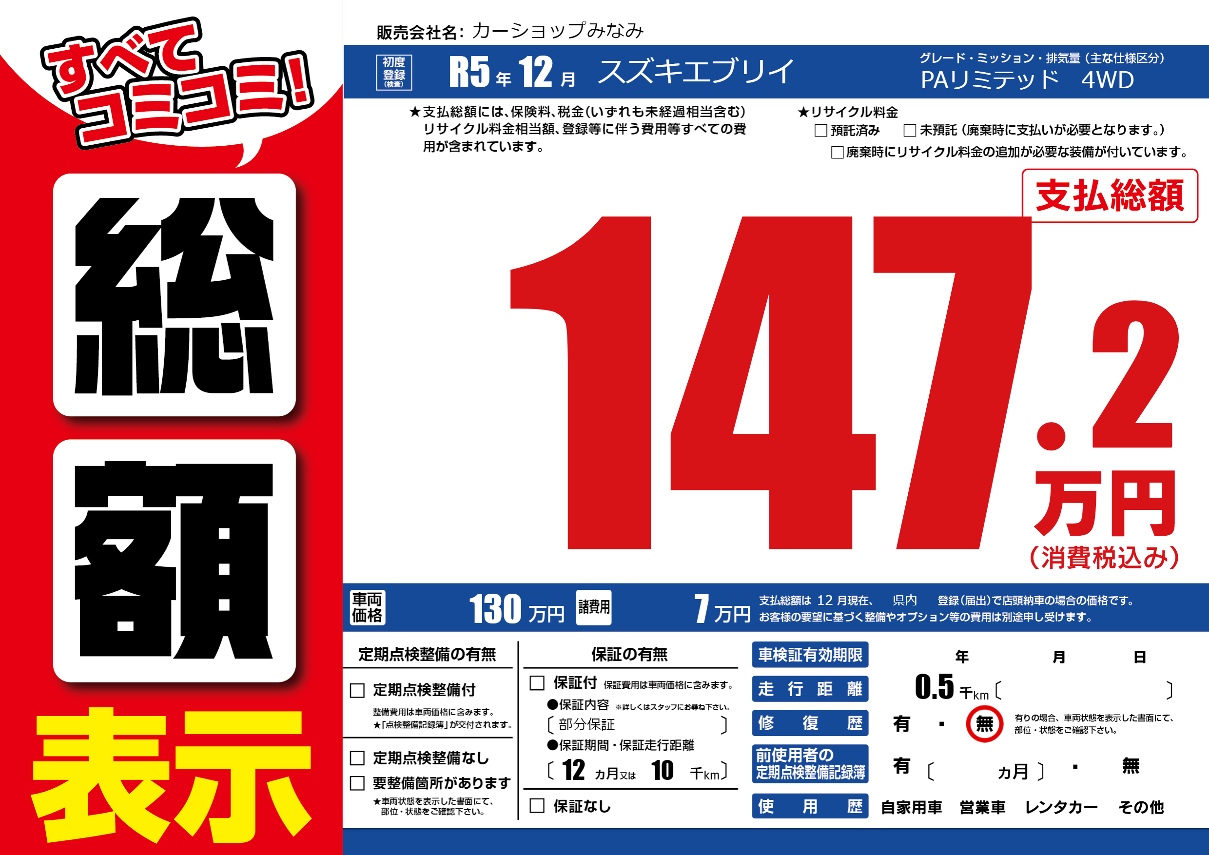 | 車名 | スズキエブリイ | グレード ミッション 排気量 |