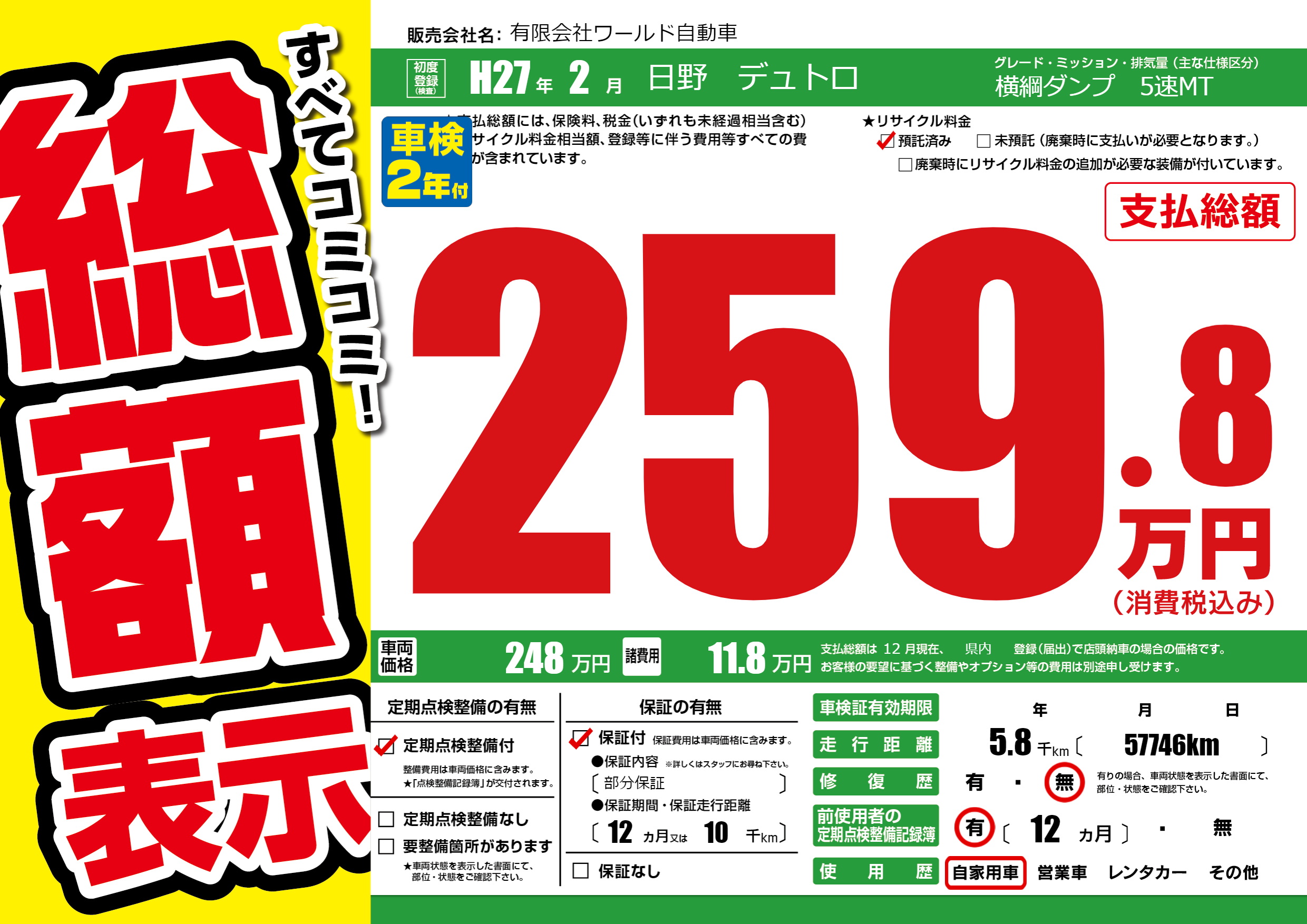 | 車名 | 日野 デュトロ | グレード ミッション 排気量 |