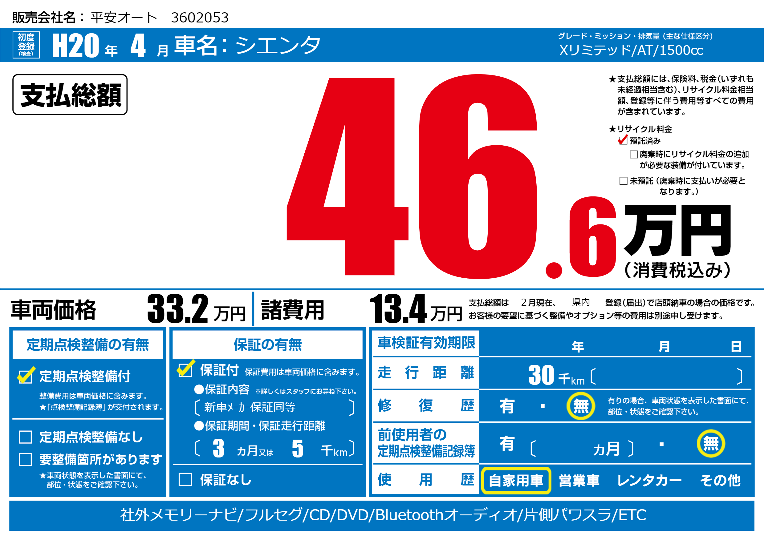 | 走行キロ | 3万km | 初年度登録 | H20年4月 |