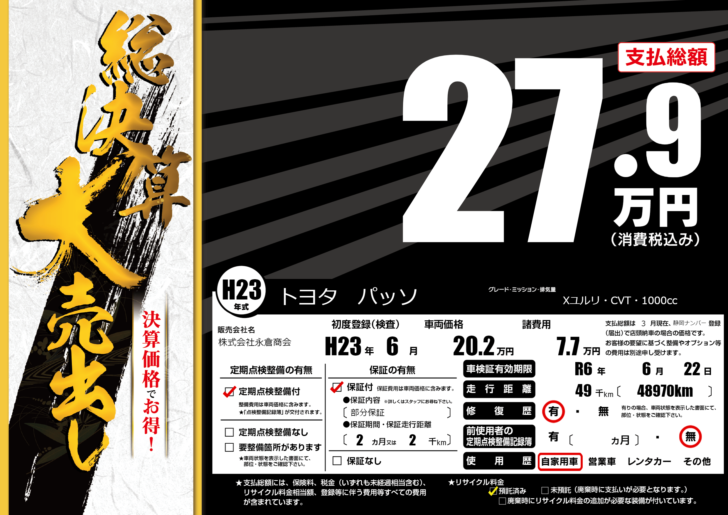 | 走行キロ | 4.9万km | 初年度登録 | H23年6月 |