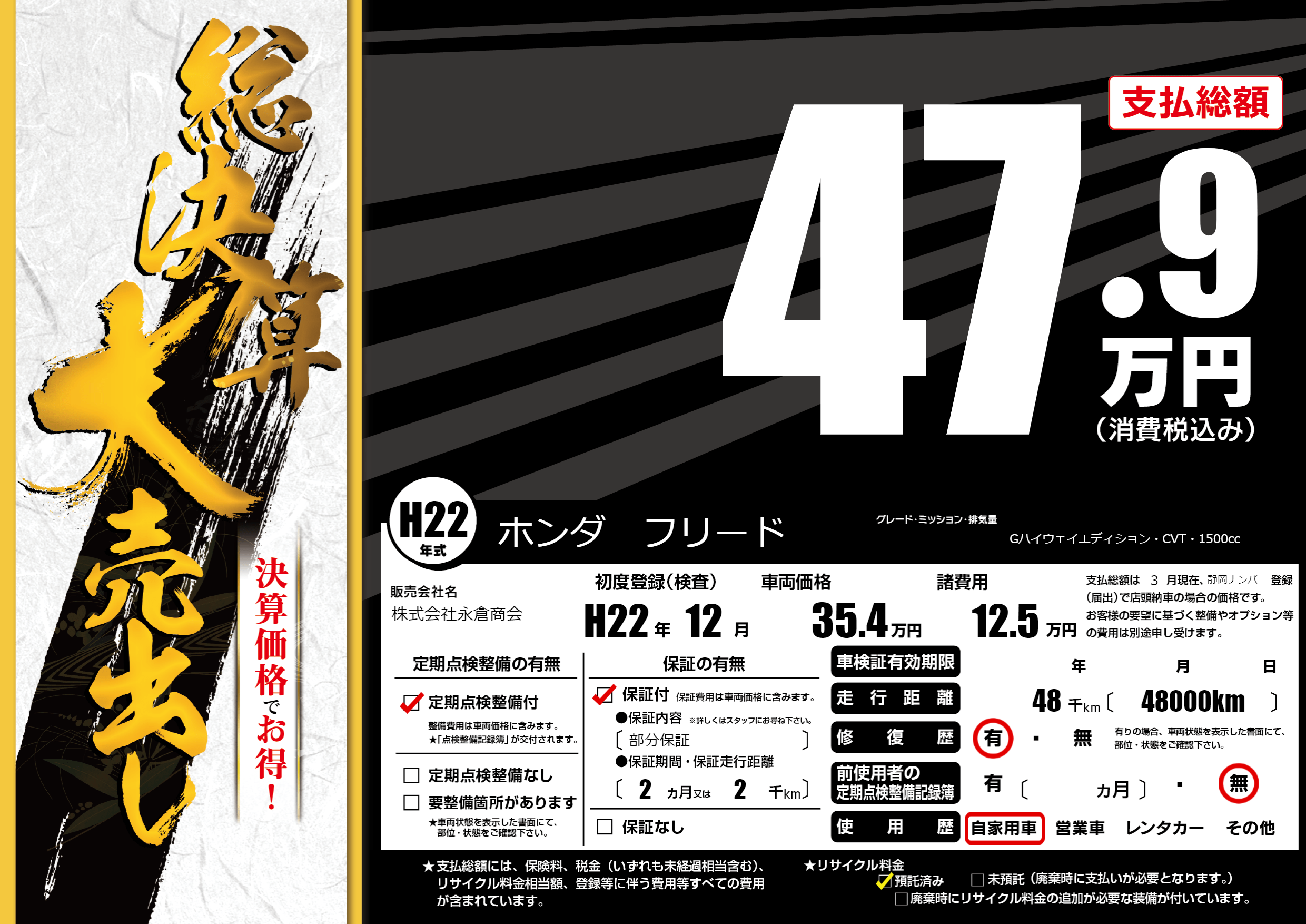 | 走行キロ | 4.8万km | 初年度登録 | H22年12月 |