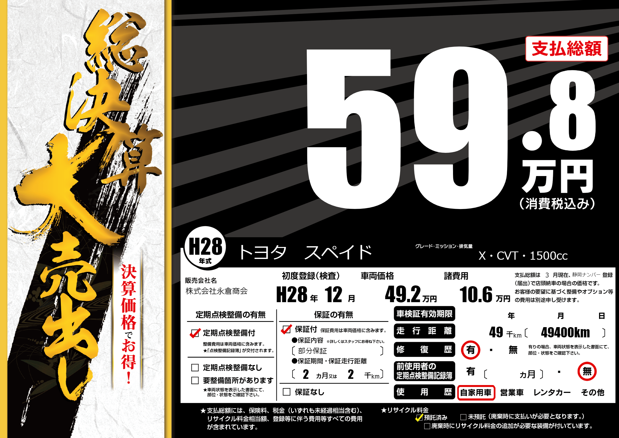| 車名 | トヨタ スペイド | グレード ミッション 排気量 |