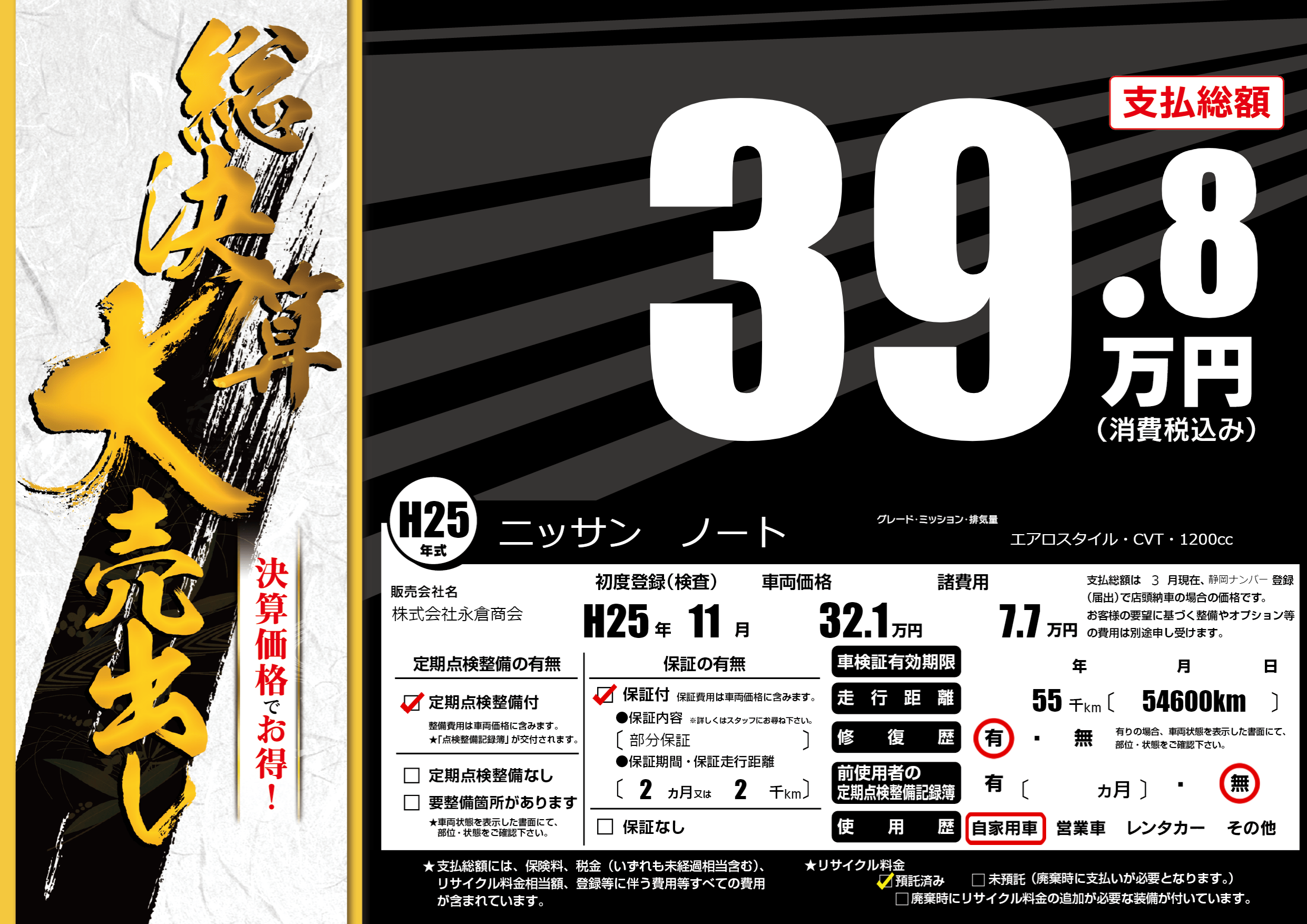 | 車名 | ニッサン ノート | グレード ミッション 排気量 |