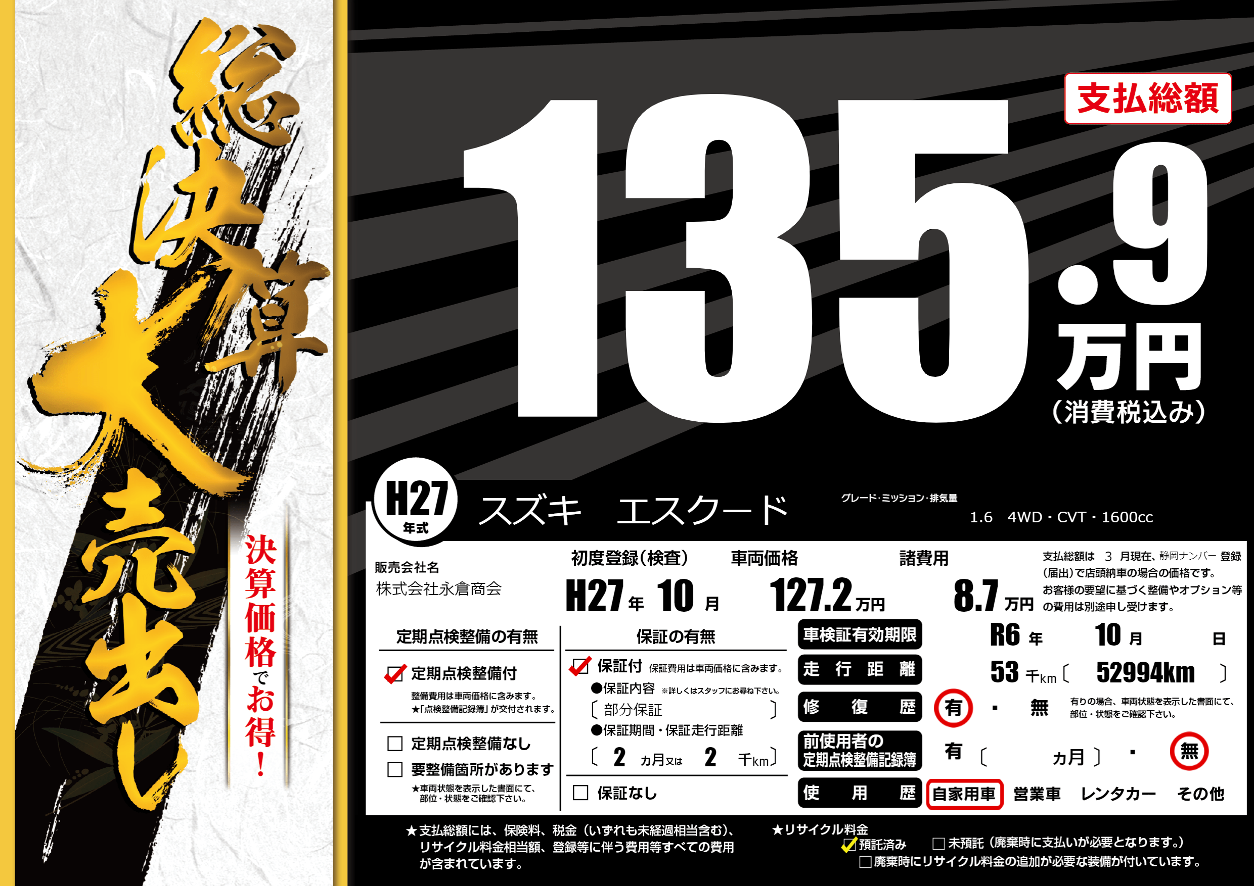 | 走行キロ | 5.3万km | 初年度登録 | H27年10月 |