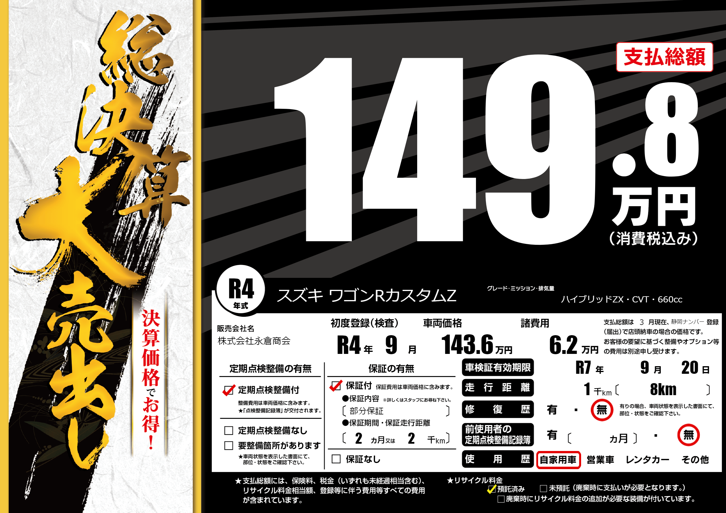 | 走行キロ | 0.1万km | 初年度登録 | R4年9月 |
