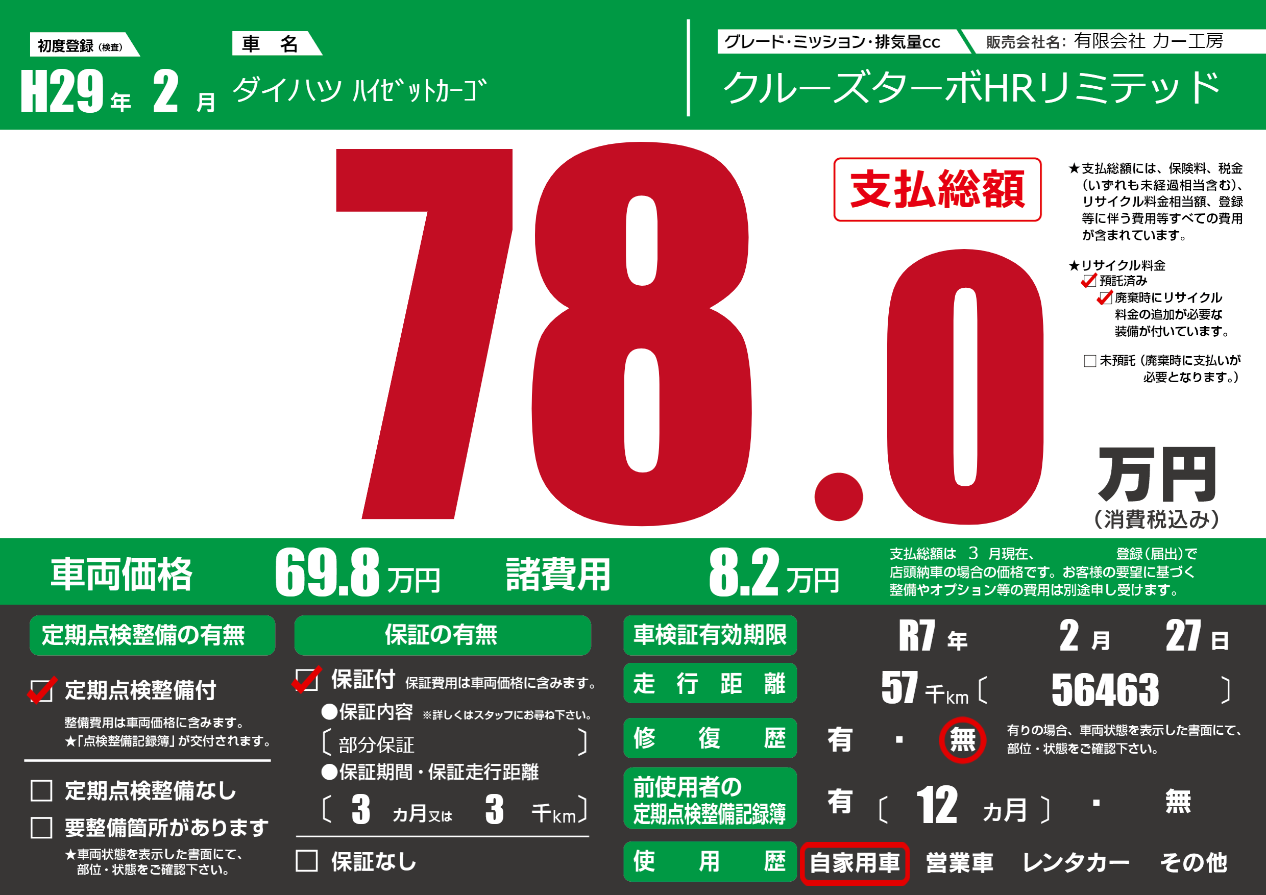 | 車名 | ダイハツ ハイゼットカーゴ | グレード ミッション 排気量 |