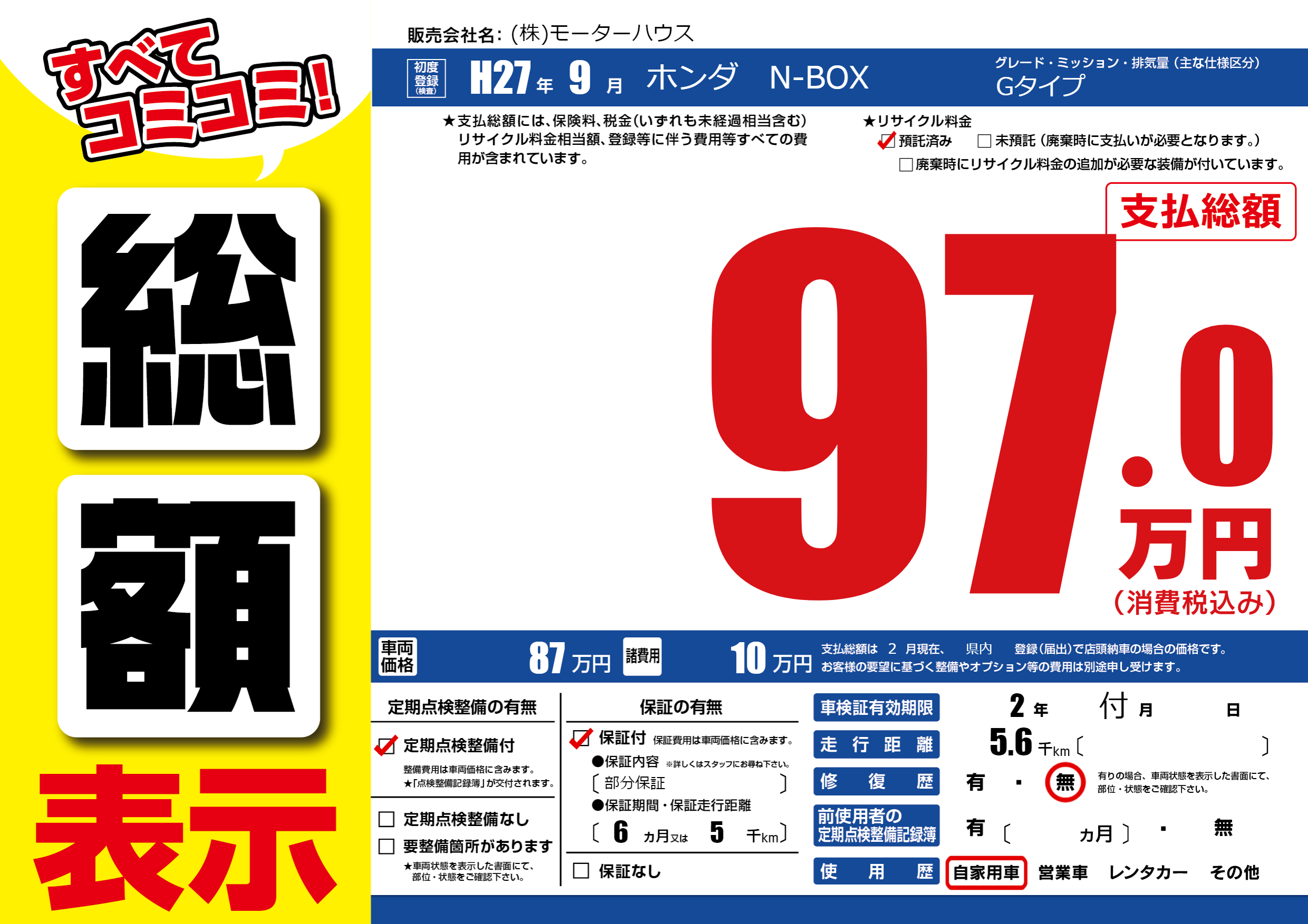 | 車名 | ホンダ N-BOX | グレード ミッション 排気量 |