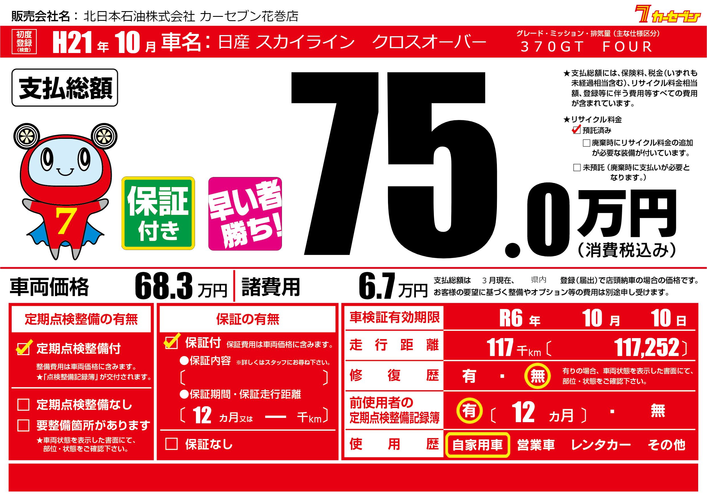 | 車名 | 日産 スカイライン クロスオーバー | グレード ミッション 排気量 |