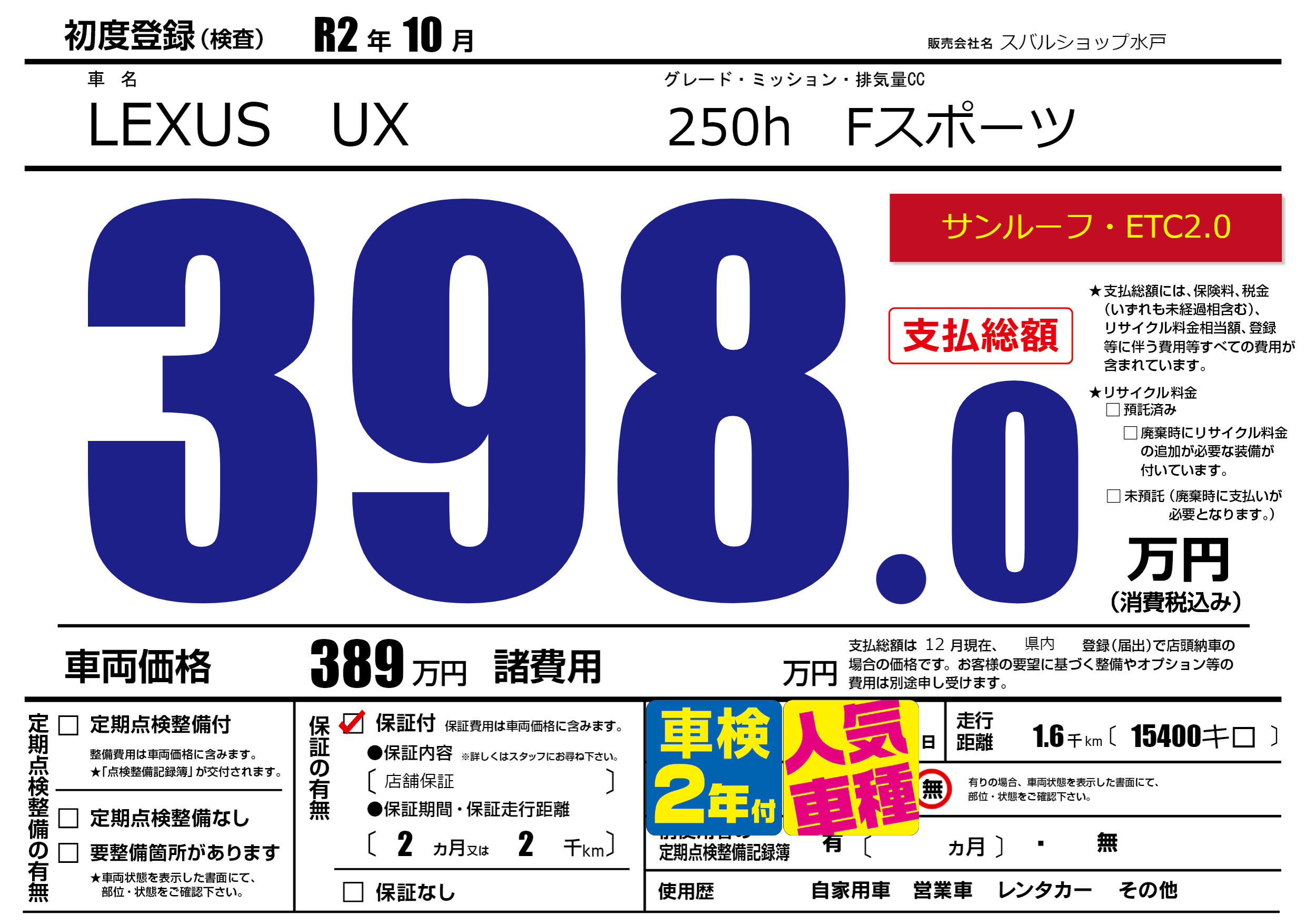 保証付き 保証内容(店舗保証) 2ヶ月または(2)千kmまで |
