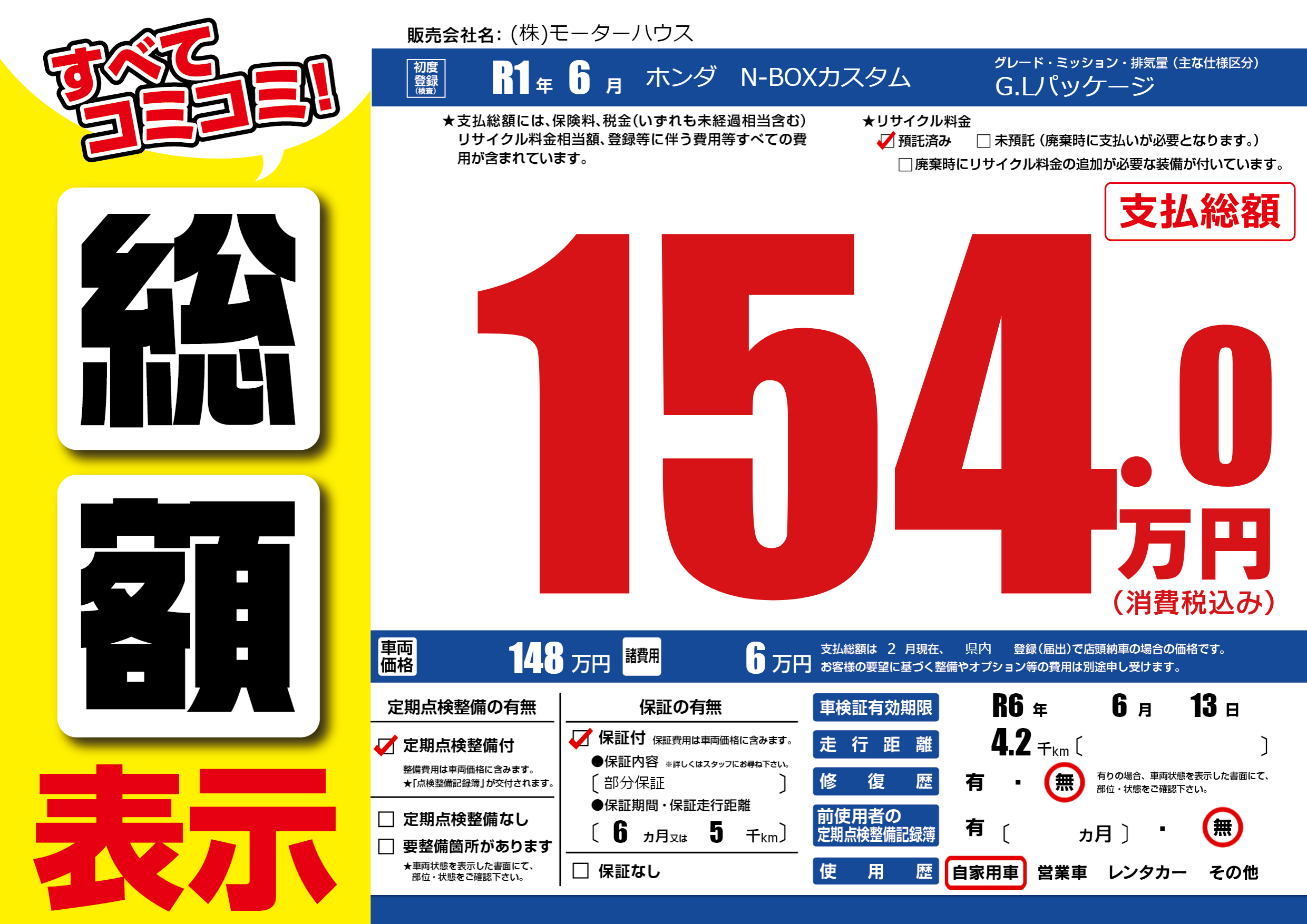 | 車名 | ホンダ N-BOXカスタム | グレード ミッション 排気量 |